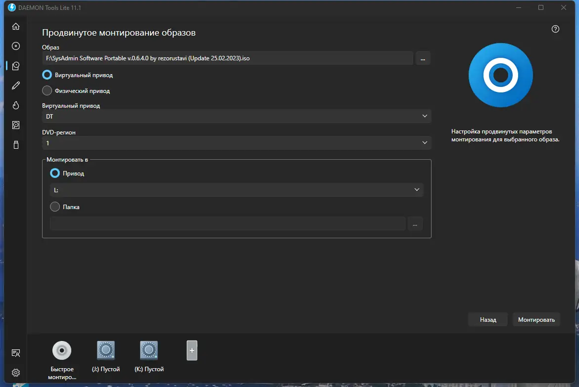 После установки программа добавляет иконку в системный трей, через которую осуществляется основное управление. Для монтирования образа достаточно щёлкнуть правой кнопкой мыши по иконке и выбрать нужный файл. Каждому виртуальному приводу можно назначить отдельную букву диска, что упрощает идентификацию. Также доступна функция автоматического монтирования при запуске системы и создание образов с оптических носителей.