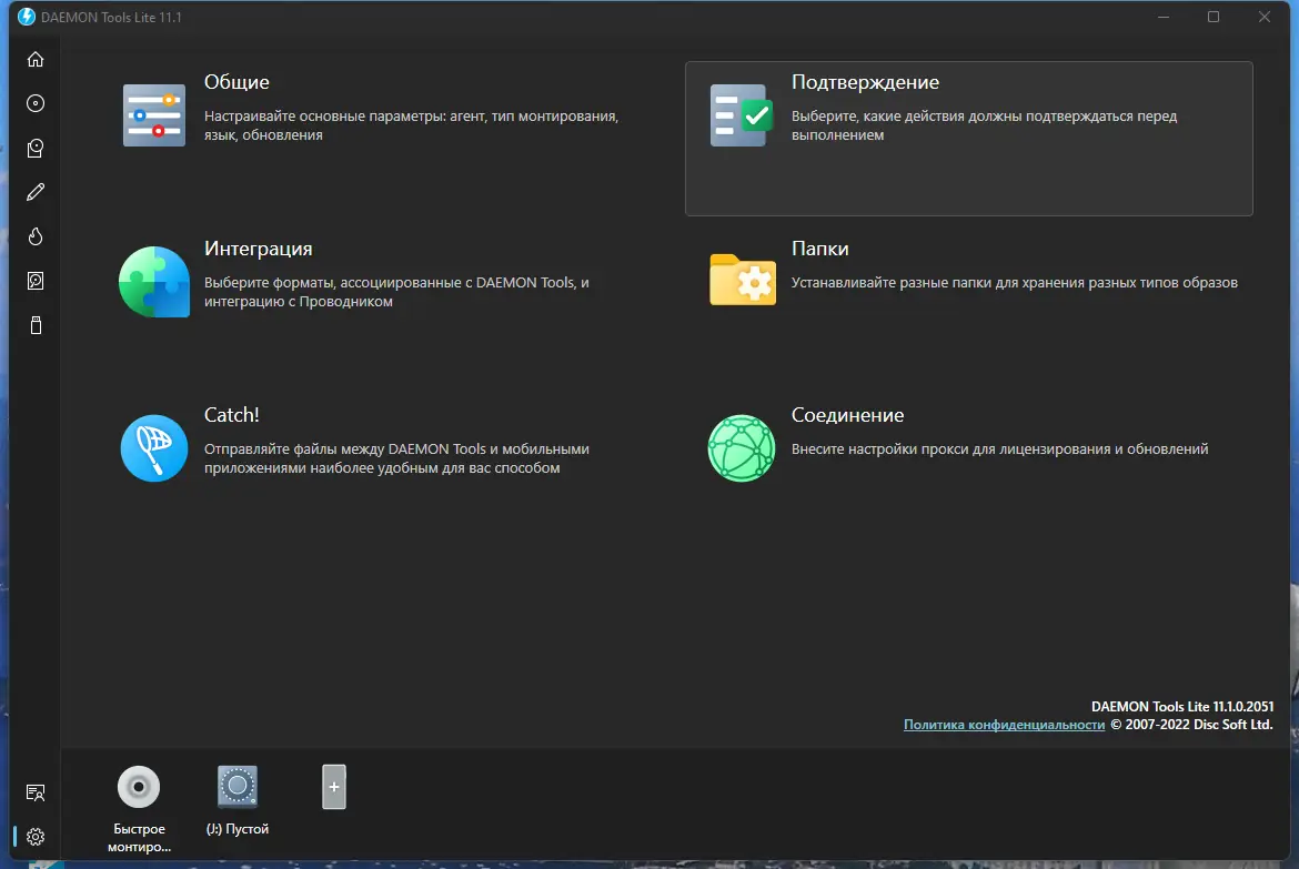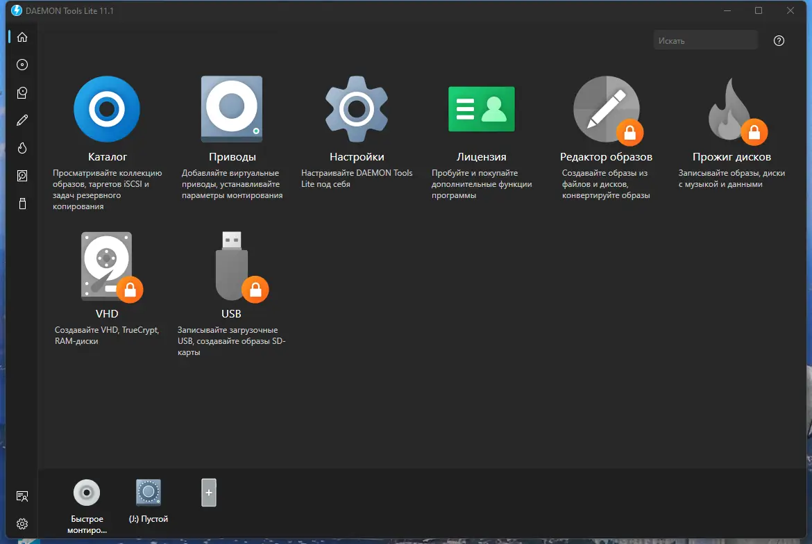 DAEMON Tools Lite — это эмулятор виртуальных дисководов, позволяющий работать с образами без использования физических дисков. Программа интегрируется в систему через иконку в трее, откуда можно управлять подключением и отключением образов. Поддержка широкого спектра форматов делает её универсальным инструментом для пользователей, которым регулярно приходится работать с резервными копиями дисков и цифровыми архивами.
