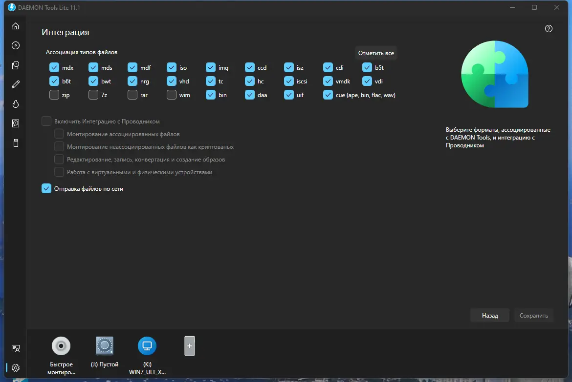Подключение и отключение виртуальных приводов происходит мгновенно, без перезагрузки системы.