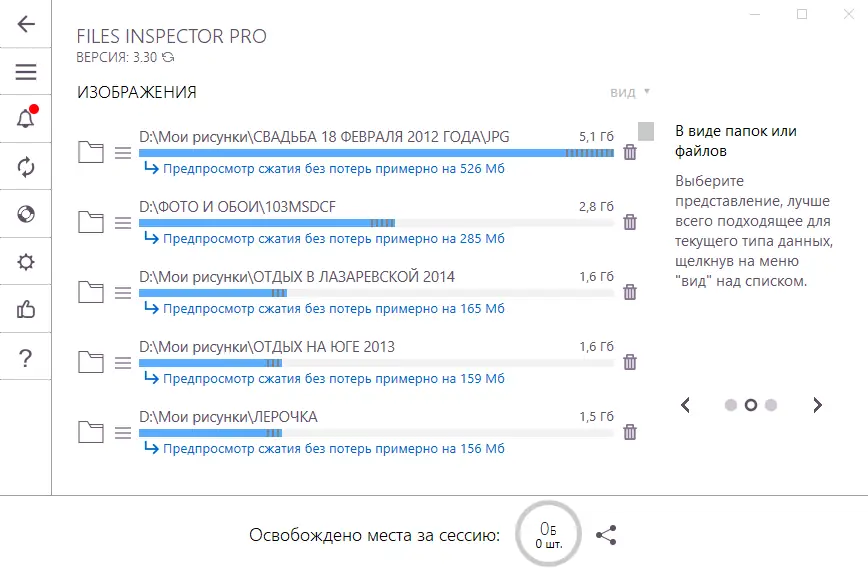 Использование программы начинается с запуска анализа — пользователь выбирает диск или конкретную папку, после чего Files Inspector сканирует содержимое и строит график использования памяти. Результаты отображаются в виде цветовых сегментов, где каждый цвет соответствует определённому типу данных. Доступ к файлам осуществляется через древовидную структуру, где можно просматривать размеры папок и переходить к нужным элементам. Для удаления достаточно выделить объект и нажать соответствующую кнопку, после чего файл будет перемещён в Корзину. В Pro версии доступна функция сжатия фото без потери качества, что особенно полезно при работе с большими архивами изображений. Дополнительно в версии 4.30 улучшена производительность при открытии крупных каталогов и реализован центр уведомлений для удобного доступа к советам и подсказкам.