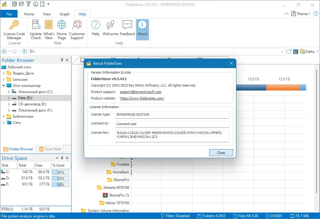FolderSizes доступна для загрузки в различных версиях, включая обновлённую редакцию 9.3 с интерфейсом на русском языке. Пользователи могут выбрать установочный пакет или воспользоваться portable-сборкой для удобного запуска с флеш-носителя. Программа совместима с операционными системами Windows 7, 8.1, 10 и 11, как в 32-, так и в 64-битных конфигурациях. После активации с помощью лицензионного ключа открывается доступ ко всем инструментам анализа и отчётности. Процедура регистрации включает применение ключа, сгенерированного при помощи встроенного кейгена.