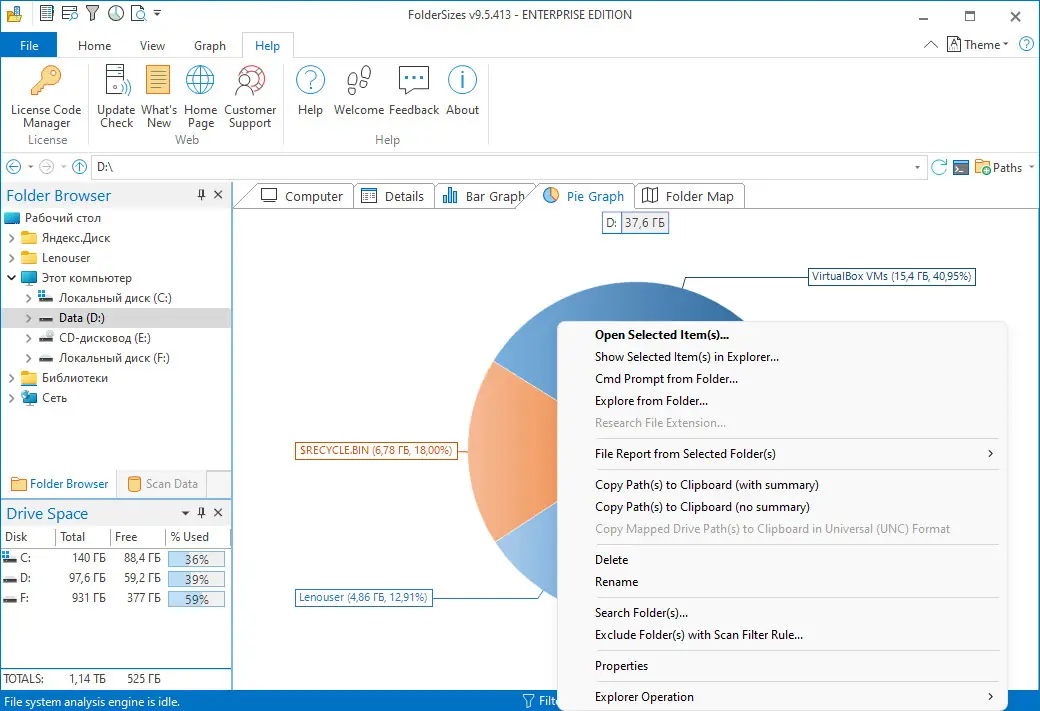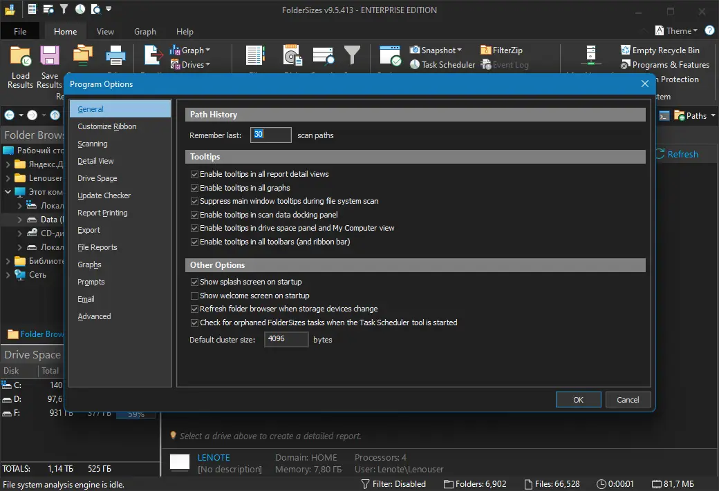 - FolderSizes интегрируется в контекстное меню Windows, обеспечивая быстрый доступ к анализу из проводника.