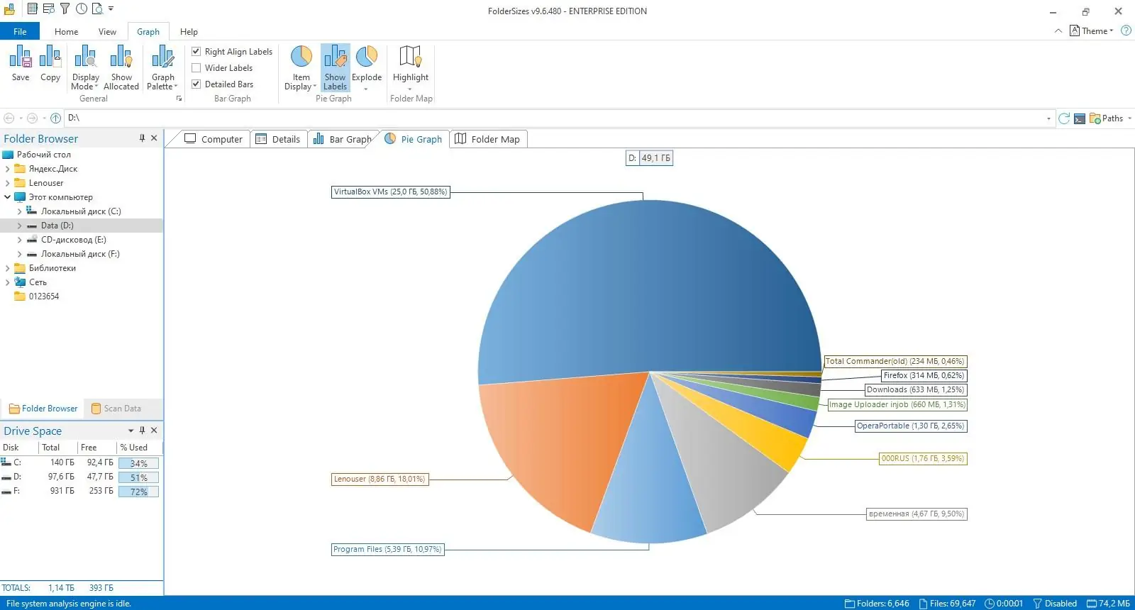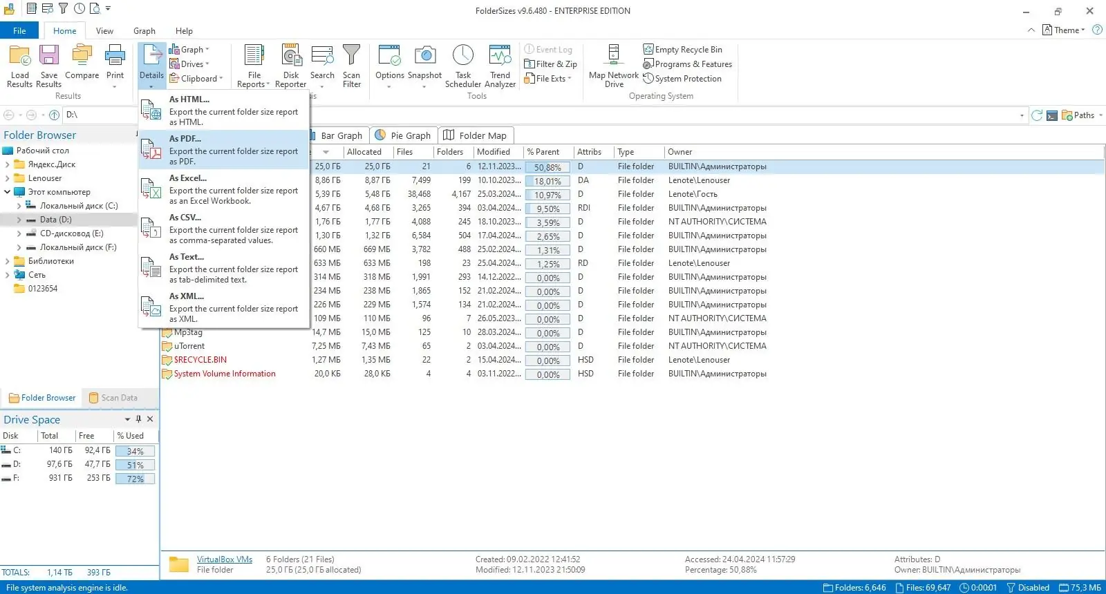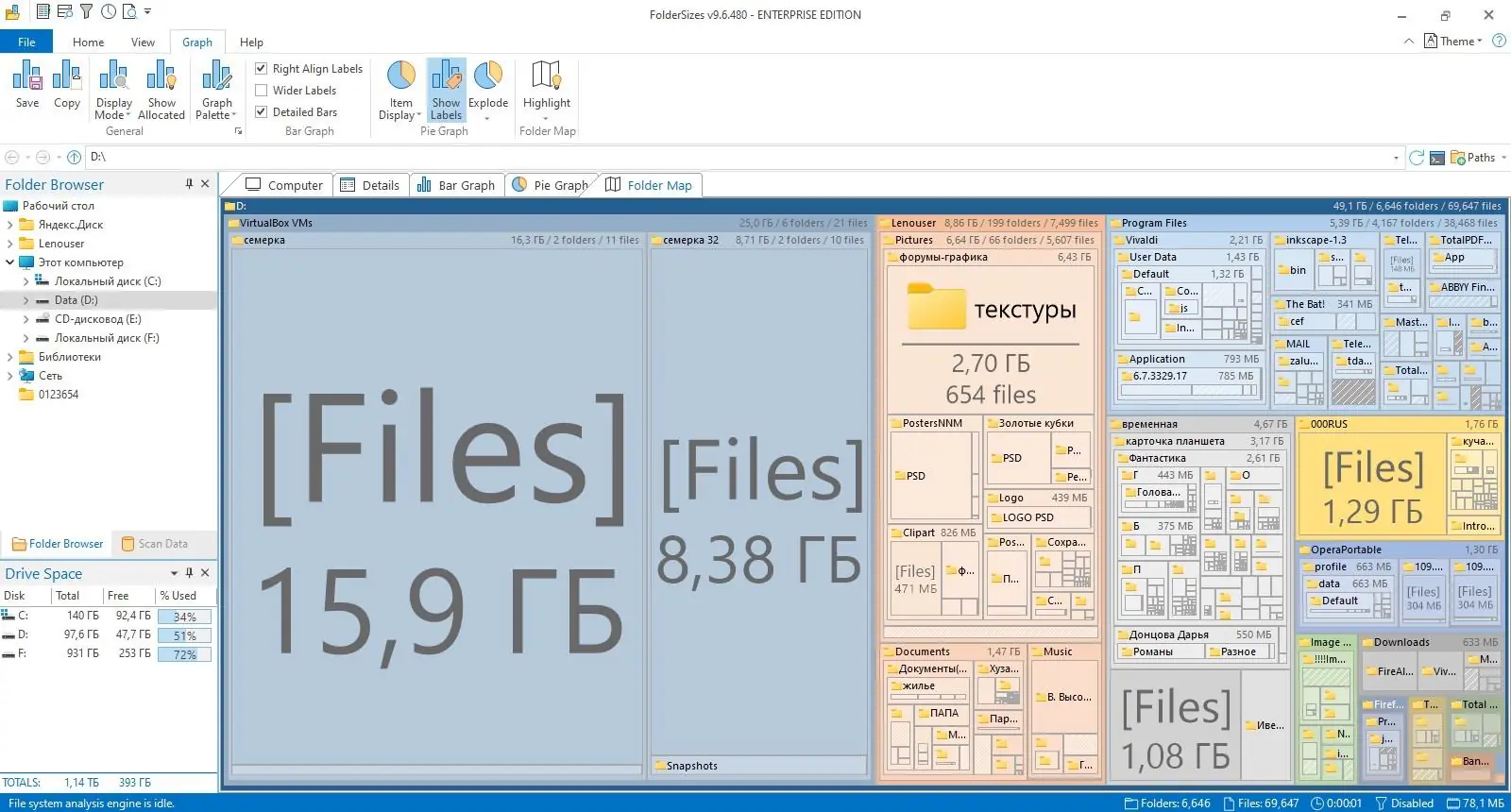 FolderSizes — это инструмент для анализа использования дискового пространства, который помогает визуализировать и управлять содержимым жёстких дисков. Программа отображает размеры папок и файлов в реальном времени, используя наглядные диаграммы и детальные отчёты. С её помощью можно быстро выявить, какие файлы и папки занимают больше всего места, и принять меры для освобождения диска.