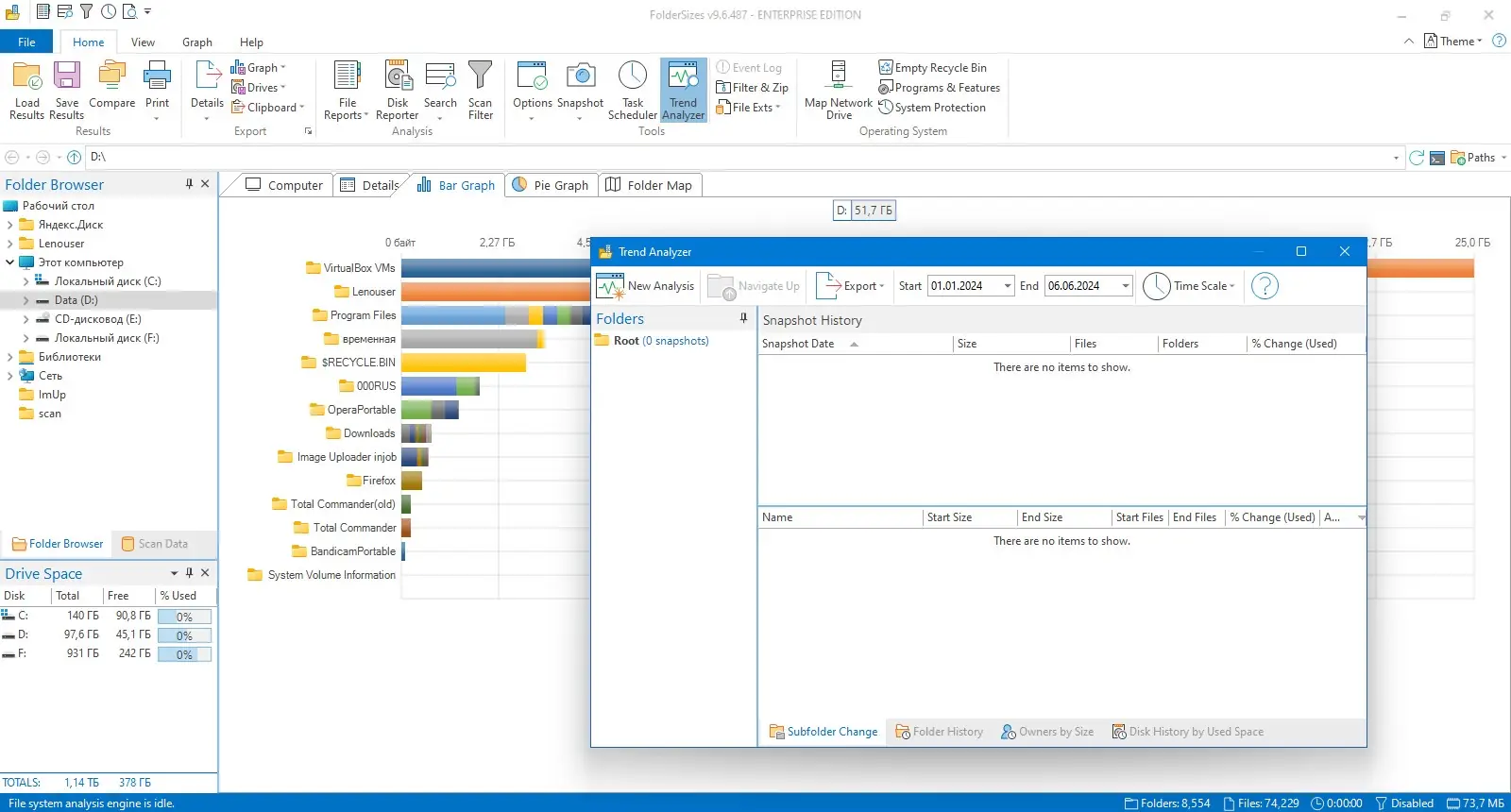FolderSizes позволяет не только находить большие файлы, но и отслеживать динамику их роста с помощью снимков файловой системы и анализа тенденций.