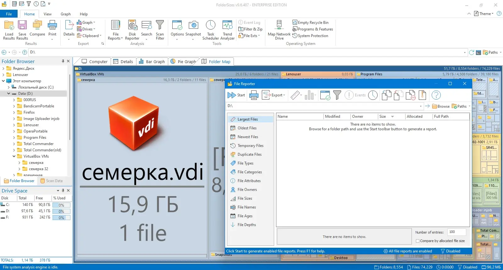- Графическая визуализация в виде круговых диаграмм, гистограмм и карт папок упрощает восприятие объема данных.
