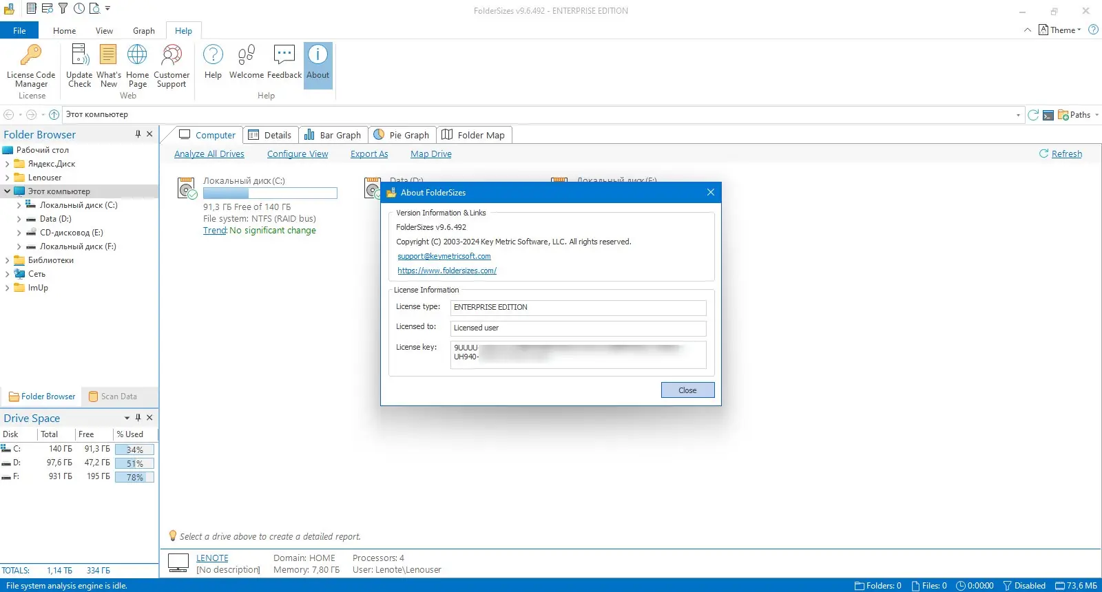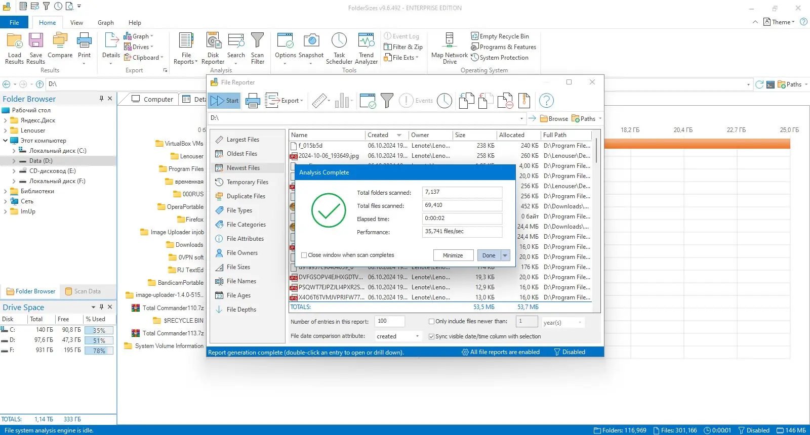 FolderSizes предоставляет комплексное решение для мониторинга и анализа файловой системы. Программа быстро сканирует диски и отображает объём данных в каждой папке, включая вложенные директории. Анализ осуществляется с использованием многопоточного механизма, что значительно ускоряет процесс, особенно на накопителях большого объёма. Результаты отображаются в виде иерархических списков, где можно детально изучить распределение файлов по размеру, дате, типу и другим критериям.