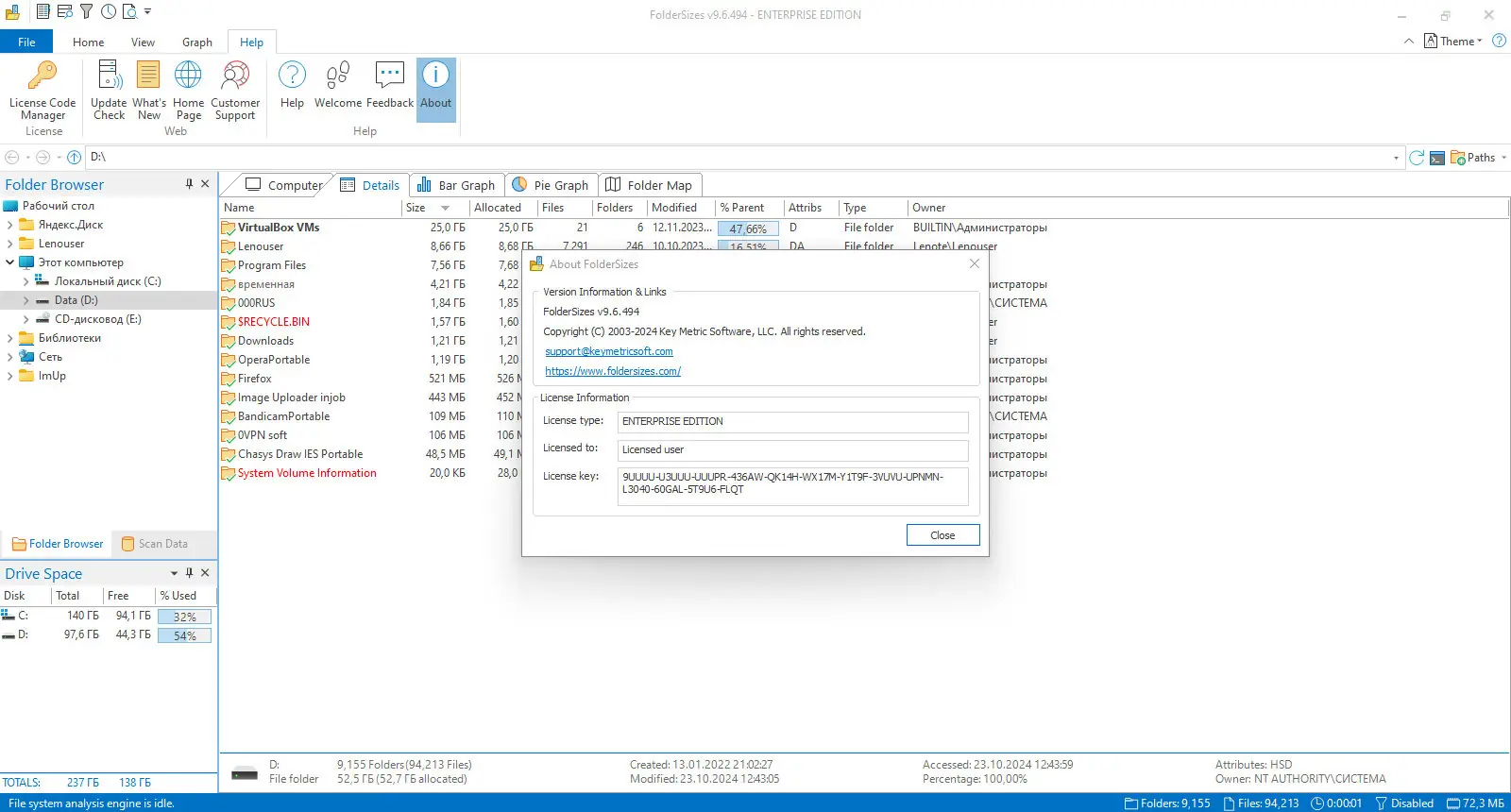 FolderSizes предоставляет комплексное решение для мониторинга и анализа дискового пространства в операционных системах Windows. Программа сканирует файловую систему с высокой скоростью благодаря многопоточному движку, отображая распределение данных в виде иерархических карт, гистограмм и круговых диаграмм. Пользователи получают доступ к детализированным сведениям о размере папок, включая размер на диске, количество вложенных файлов и подпапок, а также атрибуты и владельцев файлов.