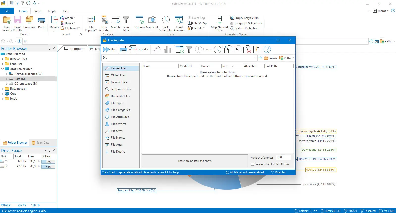 - Генерация отчетов по самым большим, старым, новым и временным файлам