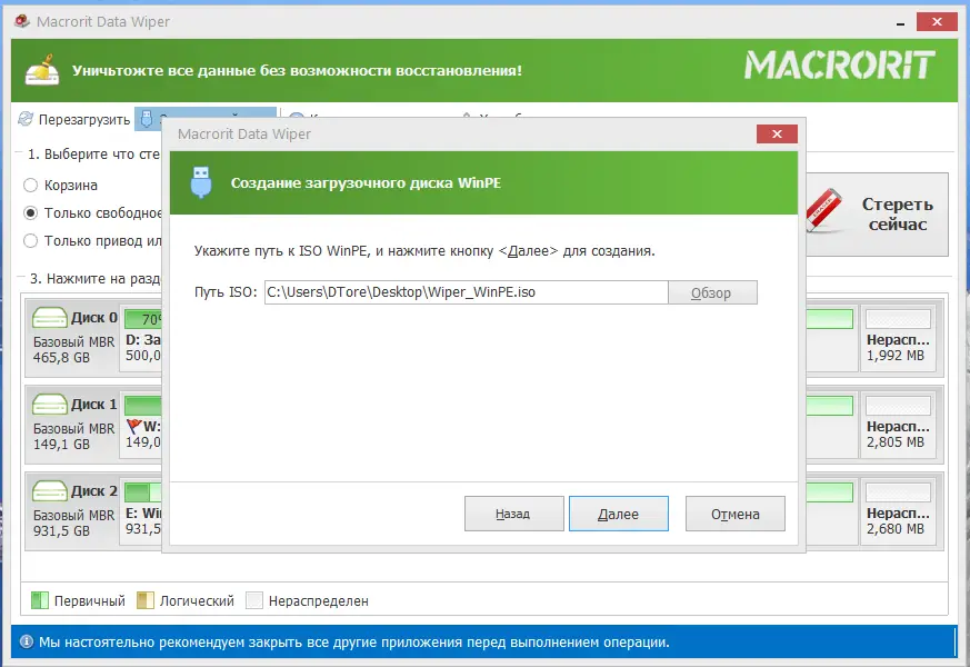 - Позволяет полностью очистить весь диск, отдельный раздел или внешнее устройство хранения