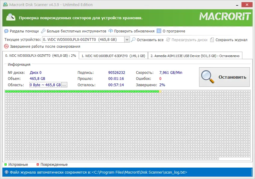 Использование программы не требует специальных знаний. После запуска отображается список всех подключённых дисков, из которого нужно выбрать нужный. Далее можно начать полное сканирование или задать конкретный диапазон секторов для анализа. Процесс сопровождается индикатором прогресса и детализацией по скорости чтения, что позволяет контролировать ход проверки. По завершении формируется отчёт с указанием количества и расположения повреждённых блоков.