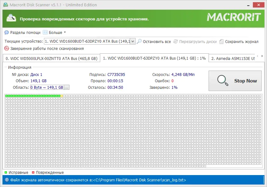 Macrorit Disk Scanner предназначен для глубокого анализа физического состояния накопителей информации. Утилита сканирует каждый сектор диска, отображая результаты в виде наглядной цветовой схемы: зелёным помечаются исправные участки, а красным — повреждённые. Это позволяет быстро оценить степень износа устройства и принять решение о его дальнейшем использовании или замене. Инструмент совместим с различными интерфейсами подключения, включая IDE, SATA, SCSI, а также с внешними носителями, подключёнными через USB или FireWire.