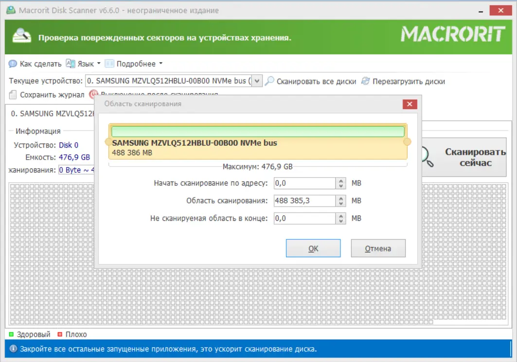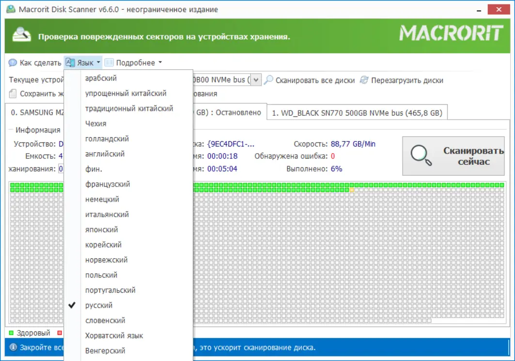 Macrorit Disk Scanner предназначен для глубокого анализа физического состояния жёстких дисков. Программа сканирует каждый сектор накопителя, отображая результаты в виде наглядной цветовой схемы: зелёный цвет указывает на исправные участки, а красный — на повреждённые. Это позволяет быстро оценить степень износа диска и принять решение о его дальнейшем использовании или замене.