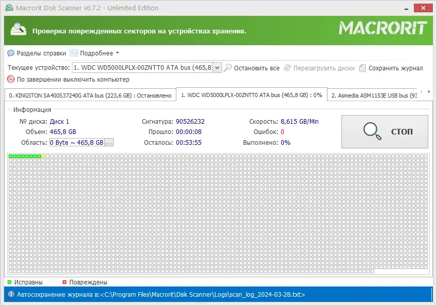 Использование Macrorit Disk Scanner не требует специальных навыков. После запуска приложения в главном окне отображается список всех подключенных дисков, из которого нужно выбрать нужный. Далее пользователь может задать диапазон секторов для проверки или просканировать весь диск целиком. По завершении процесса программа формирует отчет, где визуально выделены нормальные, медленные и поврежденные сектора. Полученные данные помогают принять решение о дальнейшей эксплуатации накопителя или его замене.