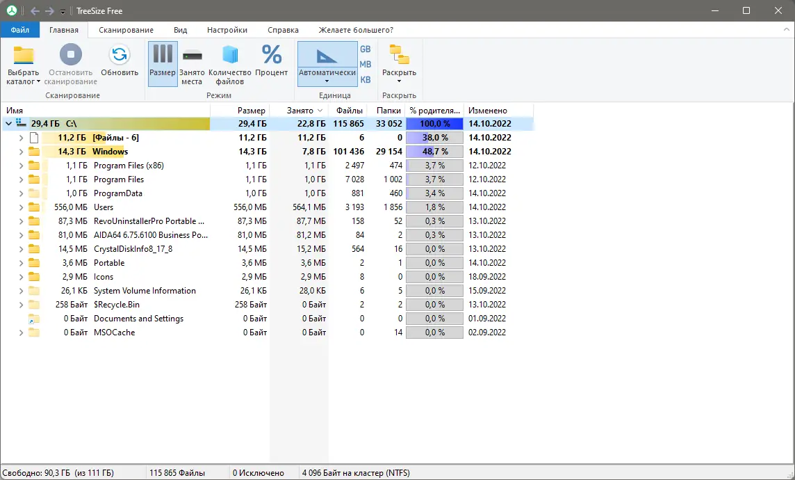 TreeSize Free — это легковесная утилита, предназначенная для визуализации структуры хранения данных на диске. Программа отображает объём информации в каждой папке, включая вложенные каталоги, и позволяет быстро находить файлы, которые неоправданно занимают много места. Сканирование осуществляется напрямую через главную файловую таблицу, что обеспечивает высокую скорость обработки даже при анализе больших объёмов данных.