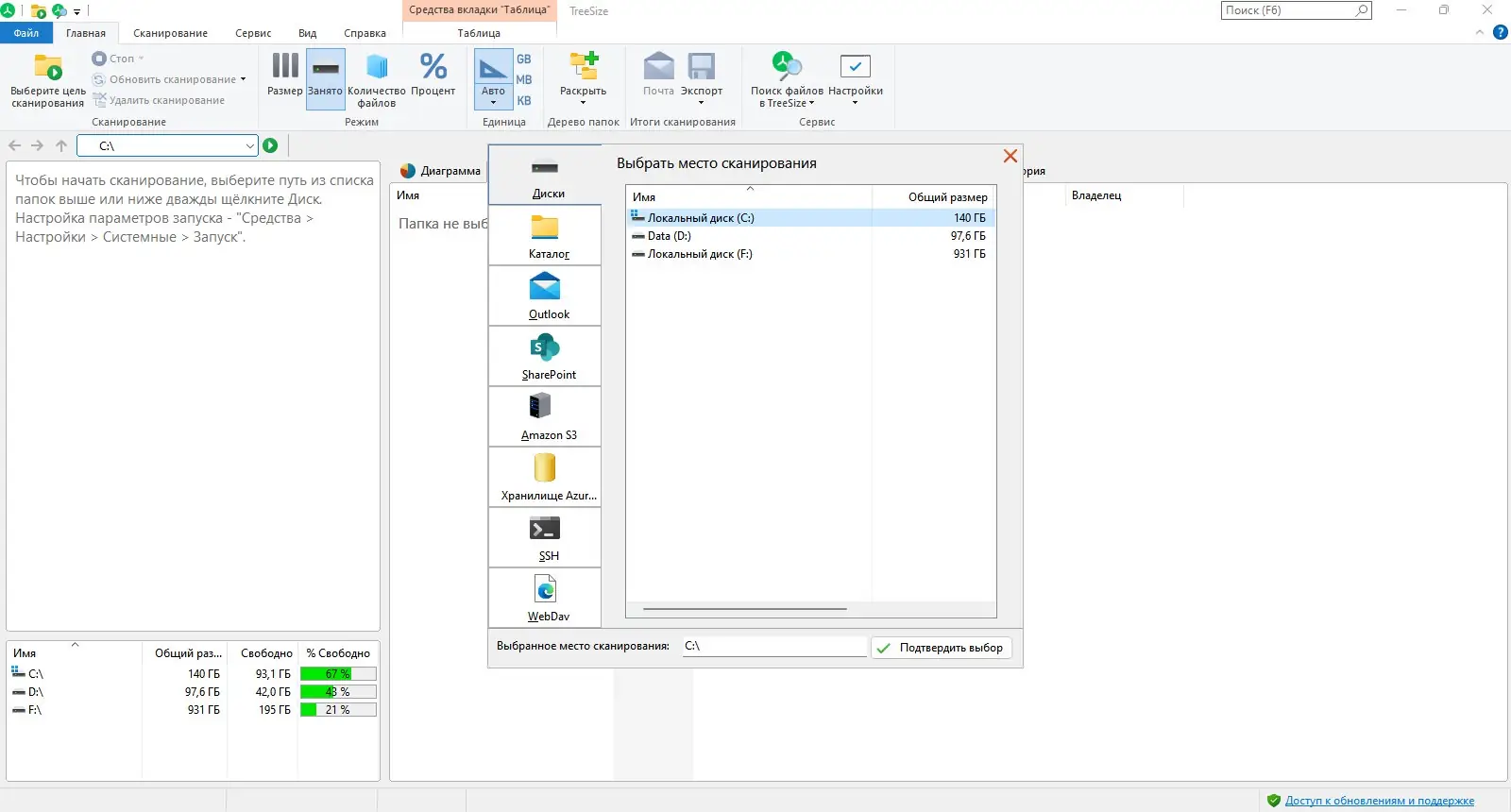 - Анализ объёма папок с отображением вложенных элементов и детальной статистики по использованию места.