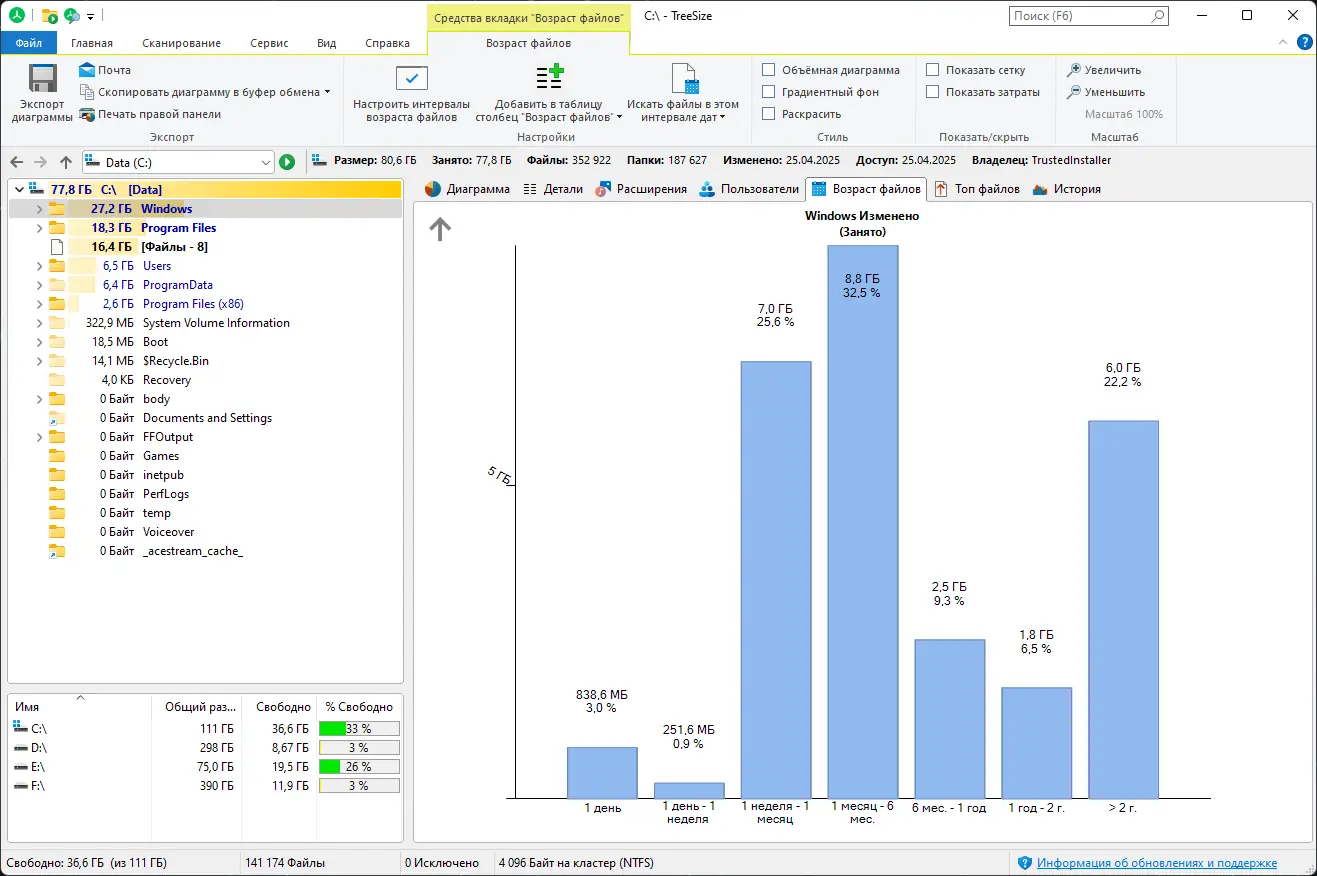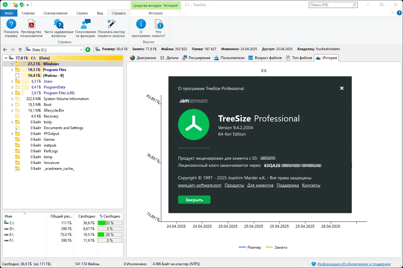 TreeSize Professional — это продвинутое решение для анализа содержимого жёстких дисков в операционных системах Windows. Программа сканирует выбранные каталоги, включая все вложенные папки и файлы, и предоставляет детальную информацию об их размере, владельцах, правах доступа и дате последнего изменения. Благодаря встроенным графикам и диаграммам, использование дискового пространства можно оценить визуально, что упрощает принятие решений по очистке и оптимизации.
