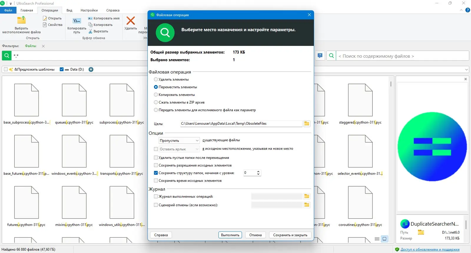 Использование UltraSearch интуитивно понятно и не требует специальных навыков. После запуска достаточно выбрать диск или папку для поиска, ввести имя файла, маску или регулярное выражение в поле запроса. Программа начинает отображать результаты в реальном времени, по мере ввода символов. Для уточнения поиска можно задействовать фильтры по дате, размеру или типу файла. Результаты можно сортировать по любому столбцу, а также сохранять шаблоны запросов — до 100 последних используются повторно через выпадающий список. Экспорт найденных данных возможен в различные форматы, включая CSV, HTML, TXT, RTF и Excel, что удобно для документирования или анализа.