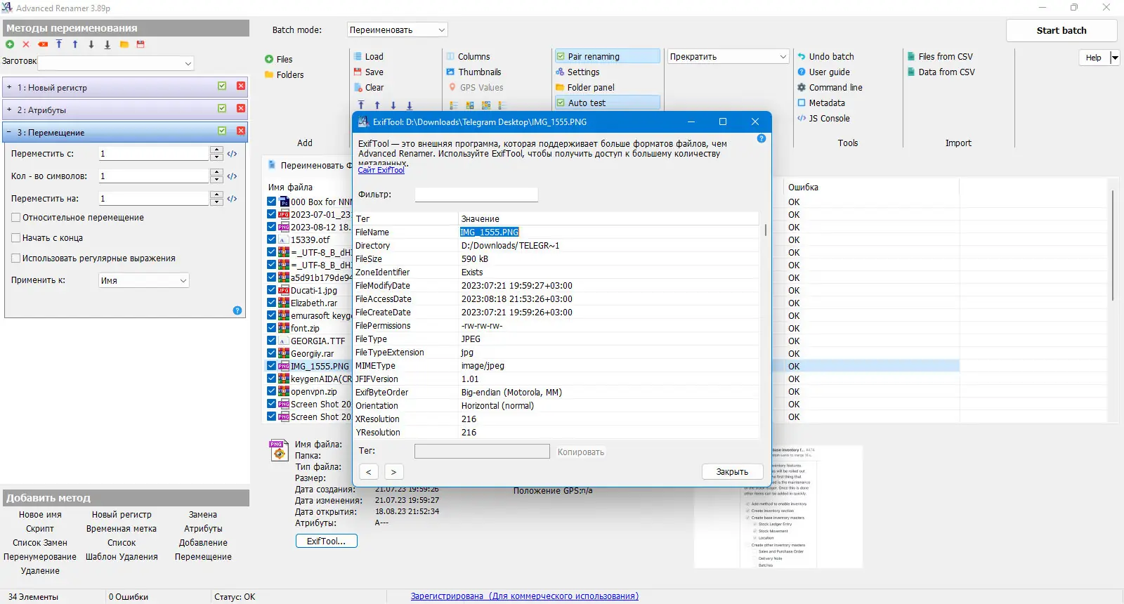 - Интеграция с EXIF-данными изображений, позволяющая использовать дату съемки, модель камеры и другие параметры в названиях.