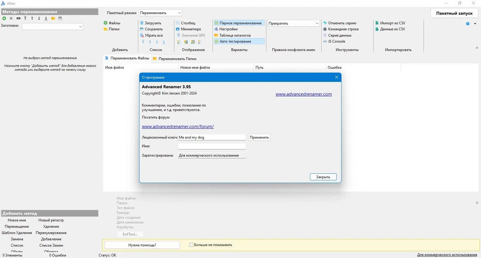 Программа доступна для скачивания в установленной и портативной версиях. Регистрация выполняется через файл lic.ini, который можно разместить в указанной директории. Утилита совместима с современными версиями Windows и не требует прав администратора при использовании портативного режима. Поддержка Unicode и расширенных символов обеспечивает корректную обработку имён на разных языках.