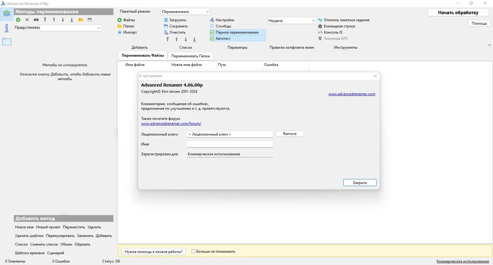 Интерфейс утилиты разделён на несколько зон: список файлов, панель методов, область предварительного просмотра и настройки правил. Чтобы начать процесс переименования, достаточно добавить нужные файлы или папки, выбрать один или несколько методов обработки — например, замену текста, добавление порядкового номера, извлечение данных из тегов — и настроить параметры. Система мгновенно отображает, как изменятся имена, что позволяет вносить корректировки до финального запуска. Для сложных задач можно комбинировать методы, задавать условия фильтрации по расширению, размеру или дате, а также настраивать автоматическое копирование в указанную директорию.