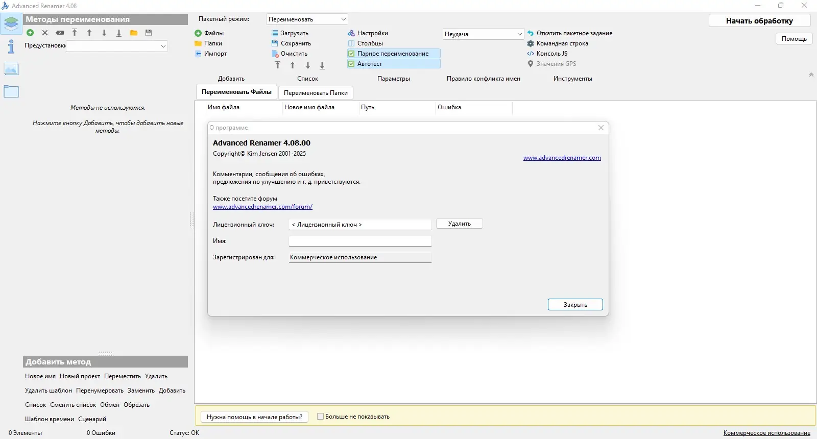 Advanced Renamer — мощная утилита для массового переименования файлов и папок в операционной системе Windows. Программа позволяет автоматизировать процесс сортировки и систематизации файлов, поддерживает работу с метаданными, такими как ID3 и EXIF, и предлагает множество методов для переименования. Она подходит как для обычных пользователей, так и для профессионалов, которым необходимо обрабатывать большие объемы данных.