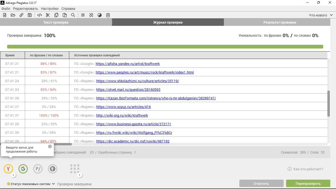 Advego Plagiatus разработан для тех, кто работает с текстовым контентом и стремится поддерживать высокий уровень оригинальности. Программа анализирует введённый текст, разбивая его на фразы, и сравнивает их с миллионами веб-страниц. Результатом становится детальный отчёт, в котором отображаются процент уникальности, список найденных источников и фрагменты совпадений. Инструмент эффективен как для проверки собственных материалов, так и для анализа сторонних публикаций.