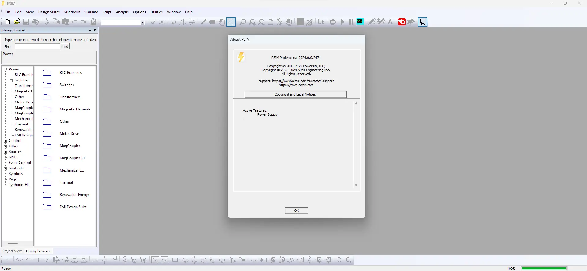 Altair PSIM доступен для установки на современных версиях операционных систем Windows. Перед запуском программы необходимо выполнить настройку лицензии через реестр и замену служебных файлов. После завершения установки и перезагрузки системы можно приступать к созданию проектов и проведению моделирования.