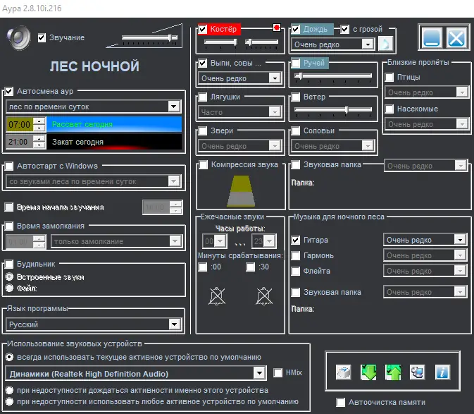 Аура Леса — это приложение, разработанное для имитации естественных звуков лесной природы в любое время суток. Пользователь может настроить воспроизведение дневных или ночных звуковых ландшафтов, включая пение птиц, шелест листвы, звуки дождя и тихие музыкальные мелодии. Программа поддерживает автоматическую смену звуковых сцен, что позволяет создавать динамичную атмосферу без необходимости постоянного вмешательства.