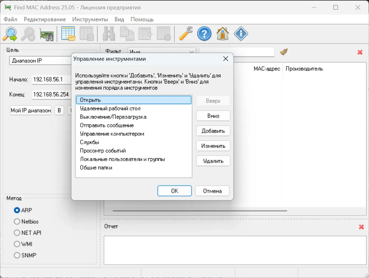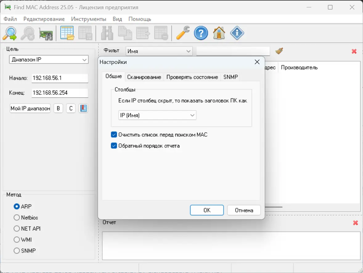 Работа с утилитой начинается с выбора метода поиска: по одному IP-адресу, диапазону или списку устройств. Пользователь указывает параметры сканирования и выбирает протокол — ARP для простых сценариев, SNMP или WMI для более детальной информации. После запуска сканирования программа отображает таблицу с MAC-адресами, именами устройств и названиями производителей.