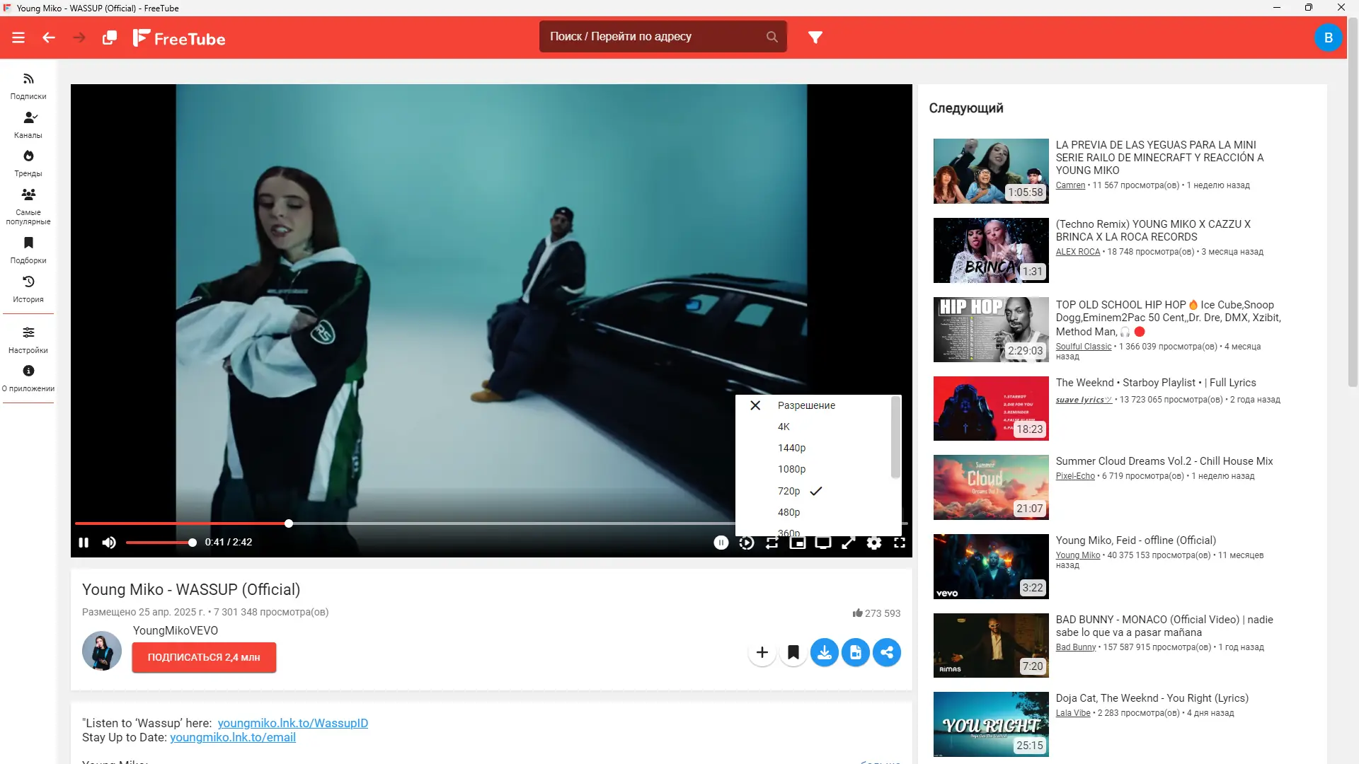 Интерфейс приложения интуитивно понятен: в верхней части расположена строка поиска, а слева — боковая панель с разделами: подписки, тренды, популярные видео и история. Пользователь может искать контент по ключевым словам, применяя фильтры по дате, длительности и типу видео. При воспроизведении доступны стандартные функции: регулировка громкости, выбор качества изображения, изменение скорости воспроизведения и включение субтитров. Поддержка полноэкранного режима и прямых ссылок на видео делает использование комфортным. Также можно делиться ссылками и настраивать отображение информации: скрывать счётчики лайков, просмотров или рекомендованный контент. Для персонализации доступно создание профилей, что удобно при разделении интересов между пользователями одного устройства.