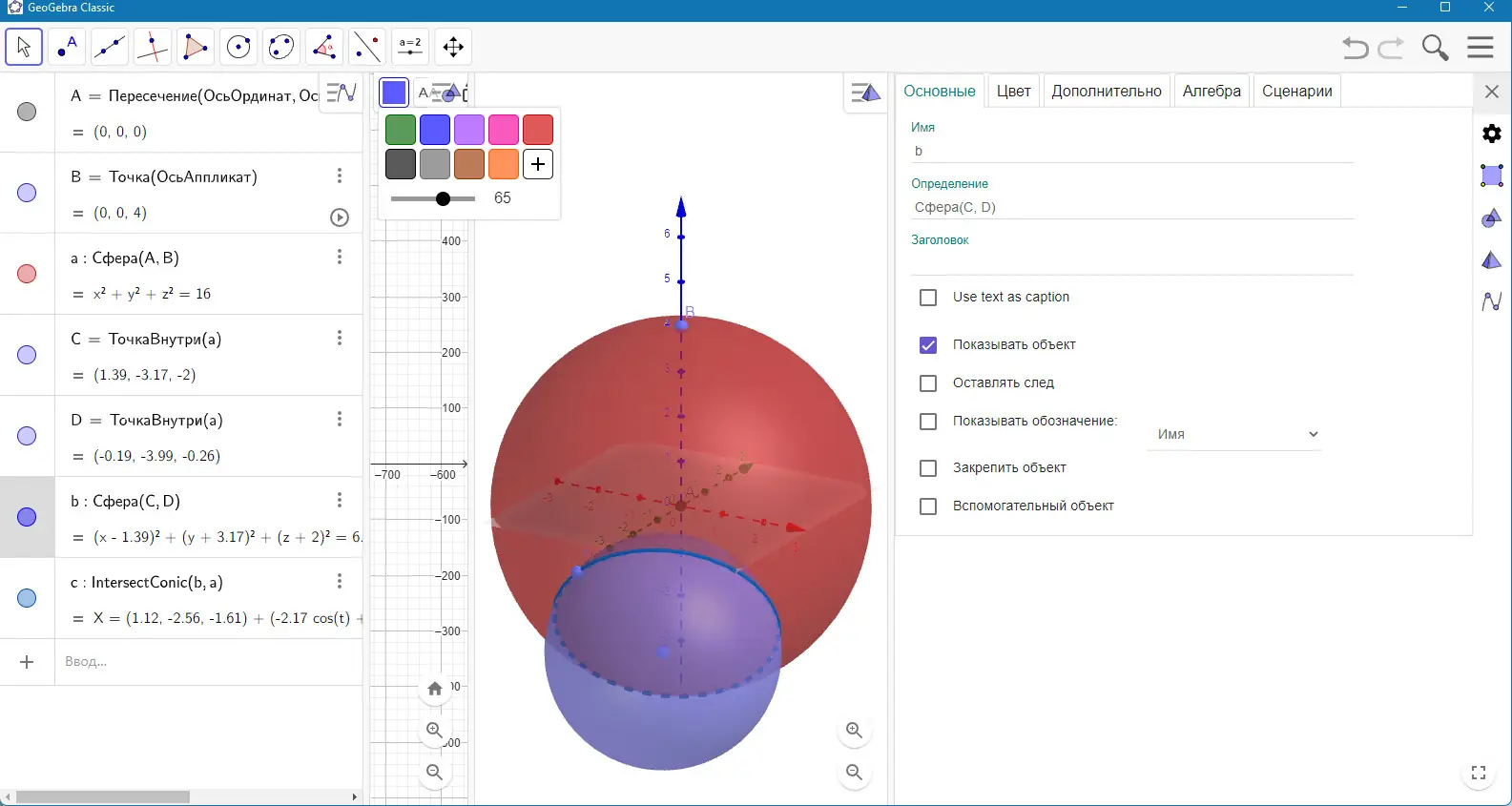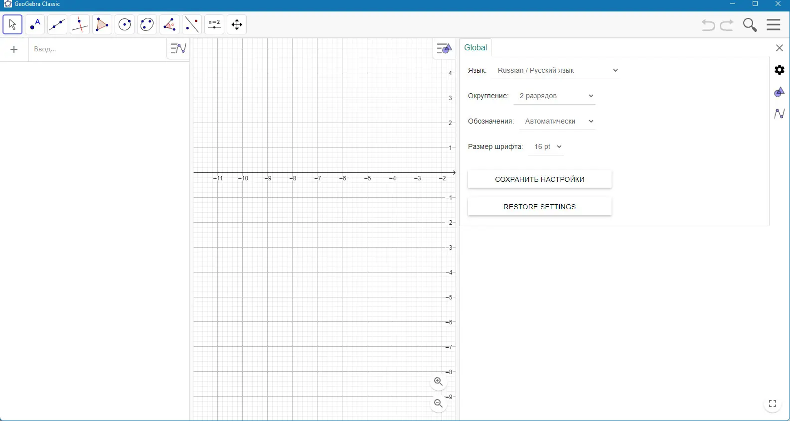 Работа с программой начинается с выбора режима: классический интерфейс classic позволяет сосредоточиться на алгебре и геометрии, тогда как 3D-режим открывает доступ к трёхмерным построениям. Пользователь может вводить функции вручную или строить объекты с помощью инструментов на панели, таких как «Перо», «Многоугольник» или «Локус». Все изменения отображаются в реальном времени, что позволяет экспериментировать с параметрами и наблюдать за преобразованиями фигур и графиков.