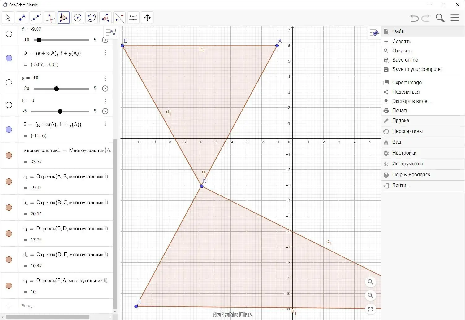 Работа с программой начинается с выбора подходящего режима: классический интерфейс, 3d-графика или таблицы. Пользователь может вводить уравнения напрямую в поле ввода, после чего программа автоматически построит соответствующий график. С помощью инструментов рисования можно создавать точки, отрезки, окружности, многоугольники и другие фигуры, которые будут динамически обновляться при изменении параметров. Режим анимации позволяет наблюдать за движением точек по траекториям, а функция аппроксимации помогает подбирать кривые под заданные данные. Все проекты сохраняются в формате .ggb, что обеспечивает совместимость и возможность обмена.