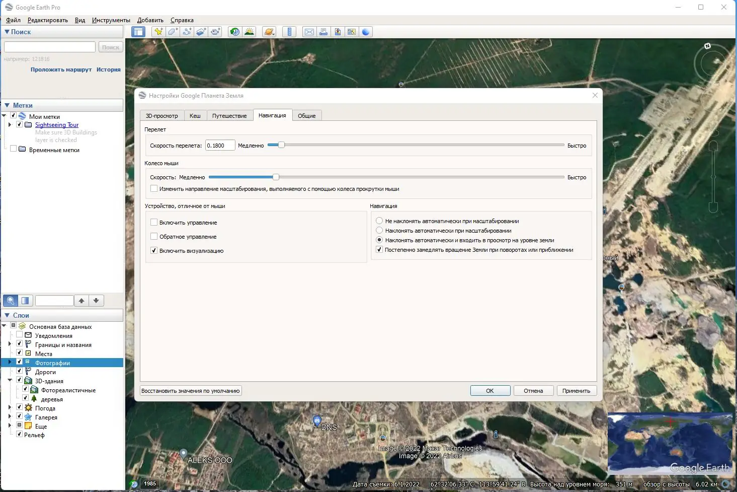 Управление в Google Earth интуитивно понятно: перемещение осуществляется с помощью мыши или клавиш-стрелок, масштабирование — колесом прокрутки. Поиск объектов или адресов выполняется через строку поиска, где можно вводить названия городов, улиц, аэропортов или координаты. Пользователи могут создавать собственные метки, добавлять описания, прикреплять изображения и сохранять маршруты. Дополнительные слои, такие как дороги, границы, погода и демография, включаются в боковой панели.