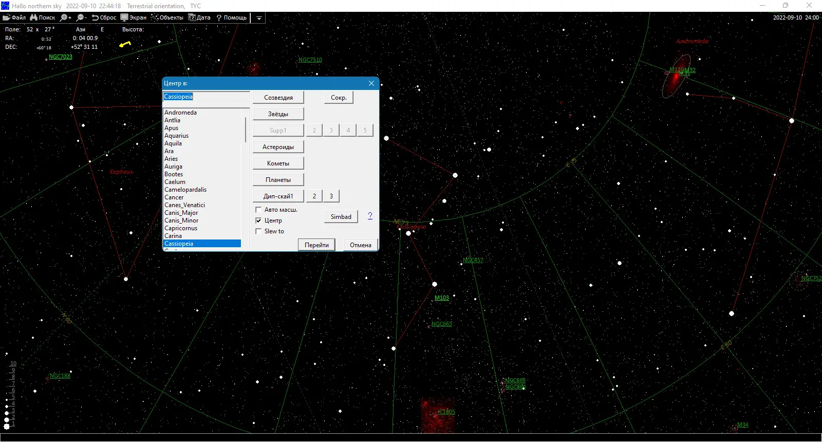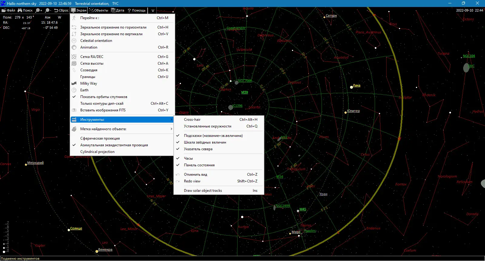 - Гибкая настройка отображения объектов — можно включать или скрывать планеты, метеорные потоки, кометы и другие категории