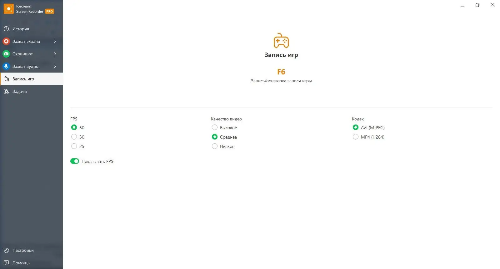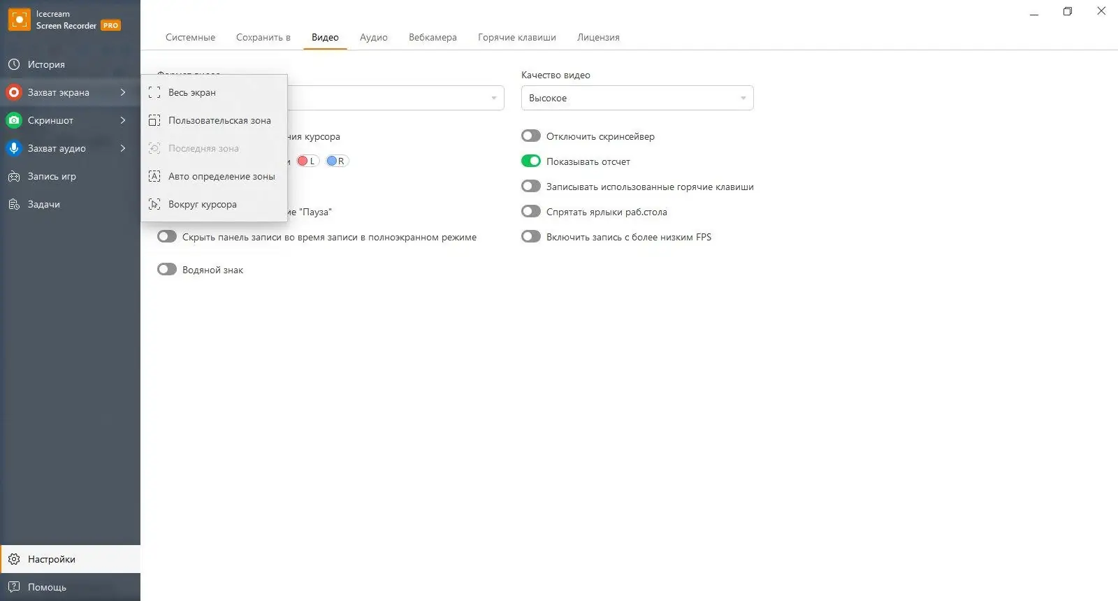 - Поддержка записи в полноэкранном и оконном режиме с возможностью выделения произвольной области