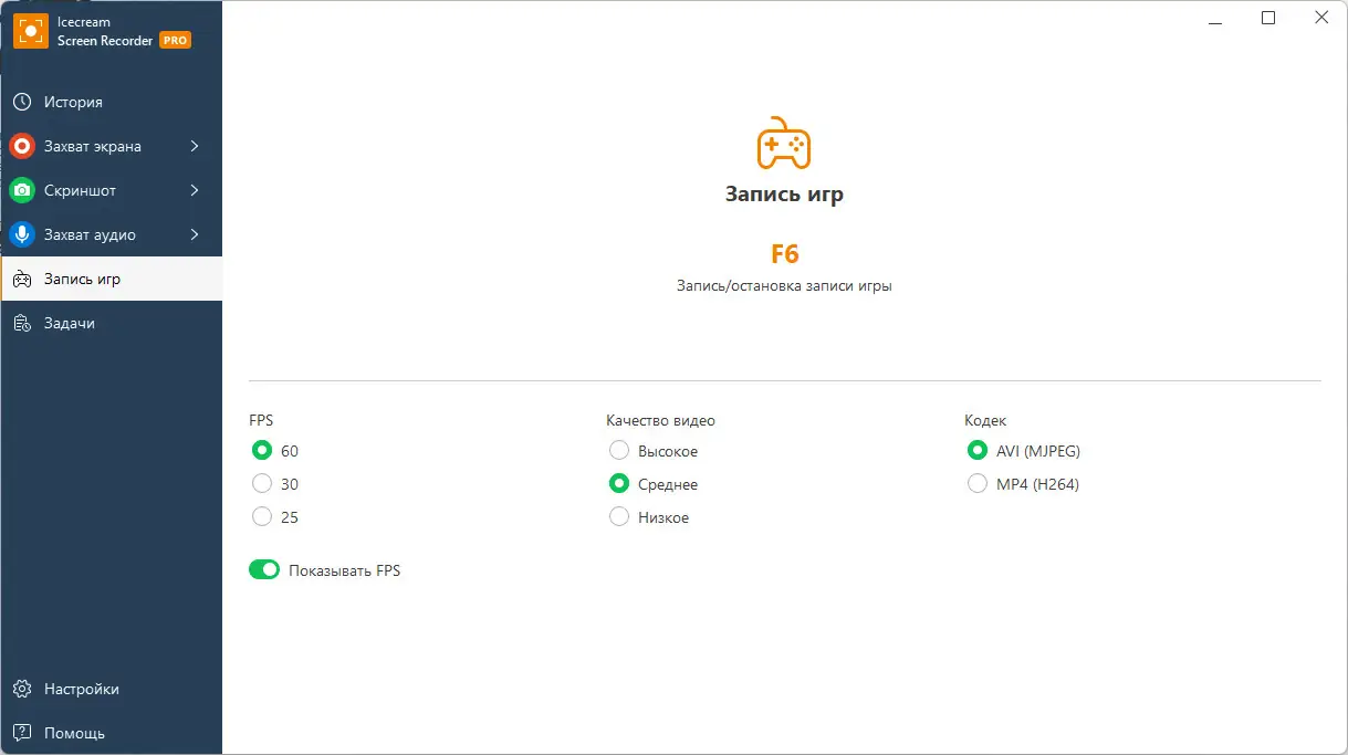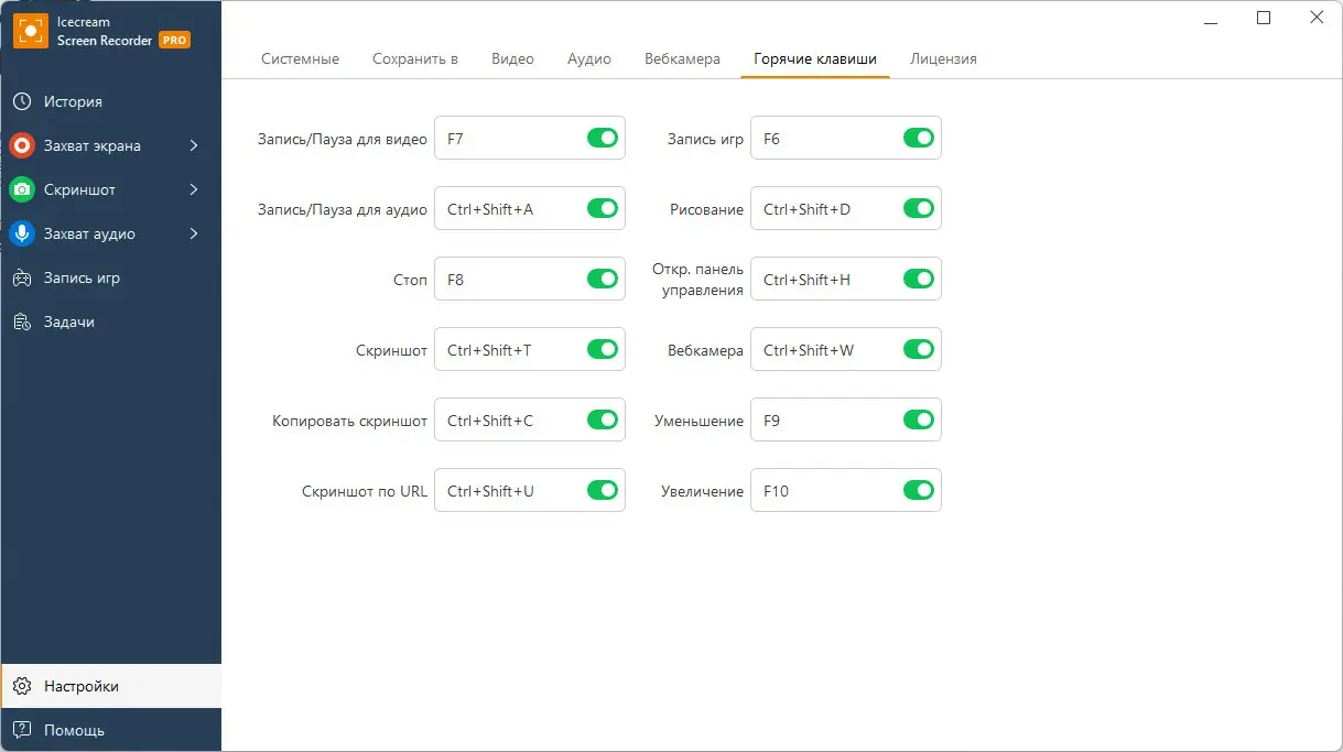 - Гибкие настройки горячих клавиш для управления записью