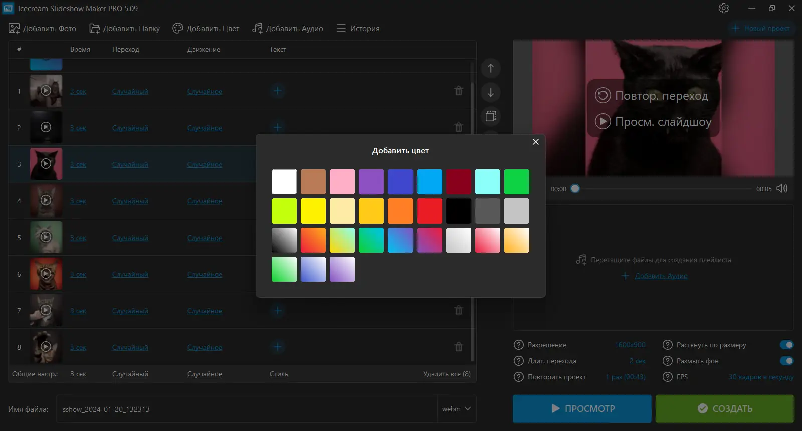 Icecream Slideshow Maker — программа для создания слайдшоу из фотографий с эффектами переходов, музыкой и поддержкой Full HD. Интуитивно понятный интерфейс позволяет быстро собрать видео, не обладая навыками монтажа. Подходит для домашнего использования, презентаций и публикации на YouTube.