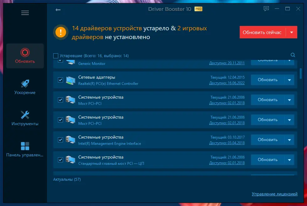 Использование IObit Driver Booster не требует технических знаний. После запуска приложение автоматически сканирует систему на наличие проблем с драйверами. По завершении проверки отображается список устаревших компонентов с возможностью обновления каждого по отдельности или всех сразу. Перед установкой новых версий система создаёт резервные копии, что позволяет быстро вернуть предыдущее состояние при необходимости. Также доступна настройка автоматического обновления во время простоя компьютера.