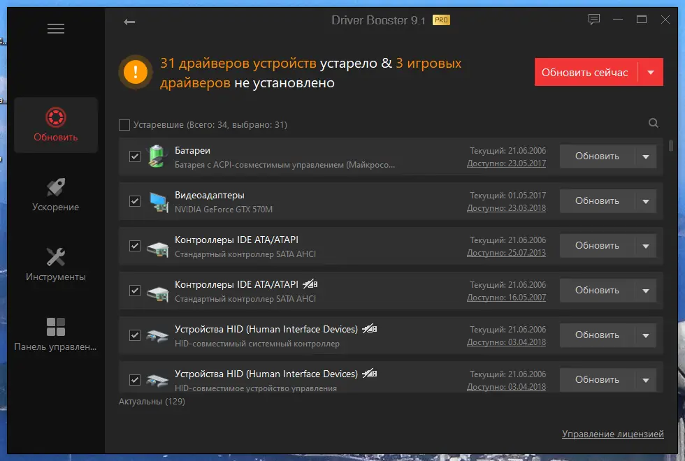 - Автоматическое сканирование системы на наличие устаревших драйверов