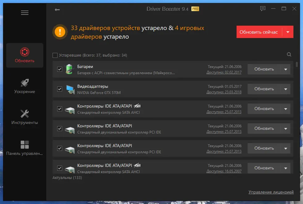 - Автоматическое сканирование системы на наличие устаревших драйверов