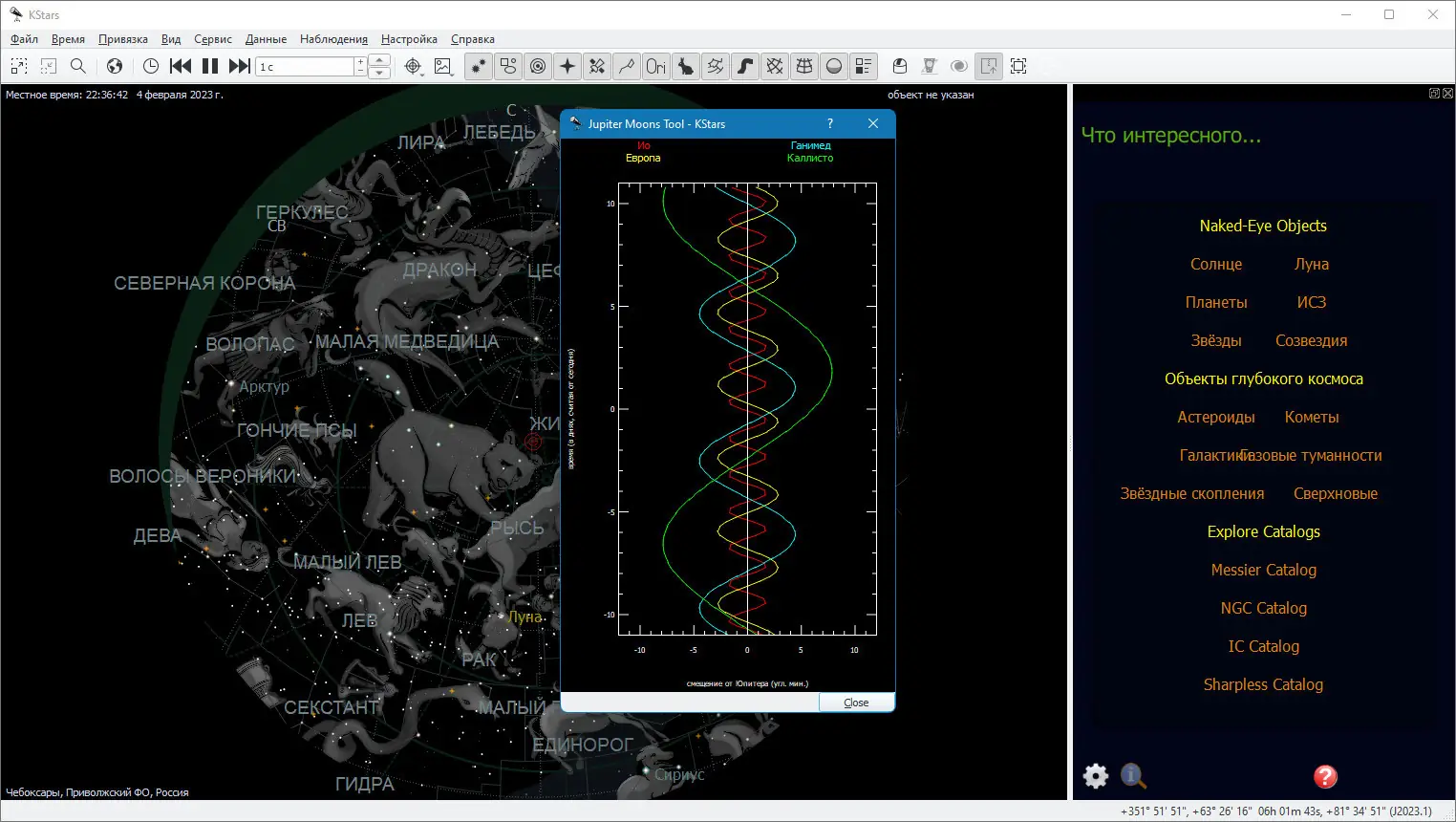 - Точная симуляция небесной сферы с возможностью изменения времени и географического положения