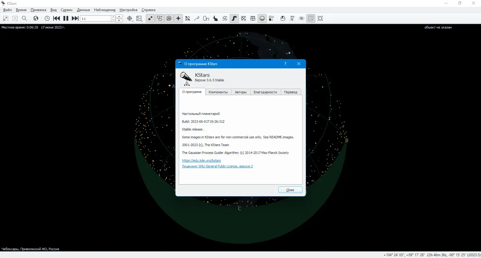KStars — это бесплатное программное обеспечение с открытым исходным кодом, предназначенное для симуляции ночного неба с высокой точностью. Программа отображает звёздное небо с учётом местоположения пользователя, даты и времени, включая миллионы звёзд, планеты Солнечной системы, кометы, астероиды и объекты глубокого космоса. Она подходит как для новичков, интересующихся астрономией, так и для опытных любителей и преподавателей, предлагая широкие возможности для обучения, визуальных наблюдений и астрофотографии.