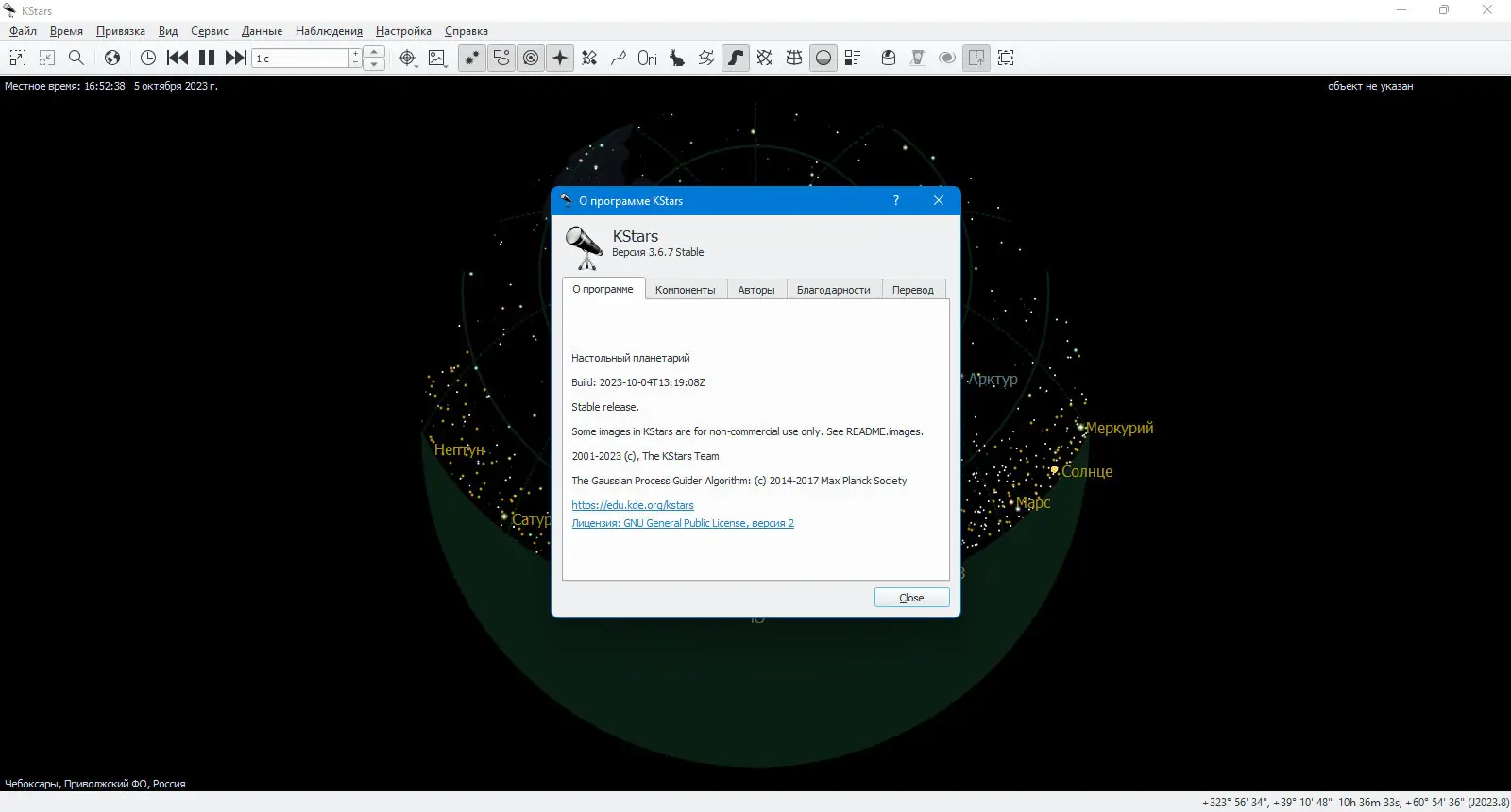 KStars — это полнофункциональное кроссплатформенное приложение с открытым исходным кодом, предназначенное для моделирования ночного неба с высокой точностью. Программа отображает звёздное небо в реальном времени или за любой выбранный период, включая миллионы звёзд, планеты Солнечной системы, спутники, кометы, астероиды и объекты глубокого космоса. Благодаря встроенному пакету Ekos, KStars выходит за рамки простой визуализации, предлагая инструменты для астрофотографии, управления оборудованием и научных расчётов.