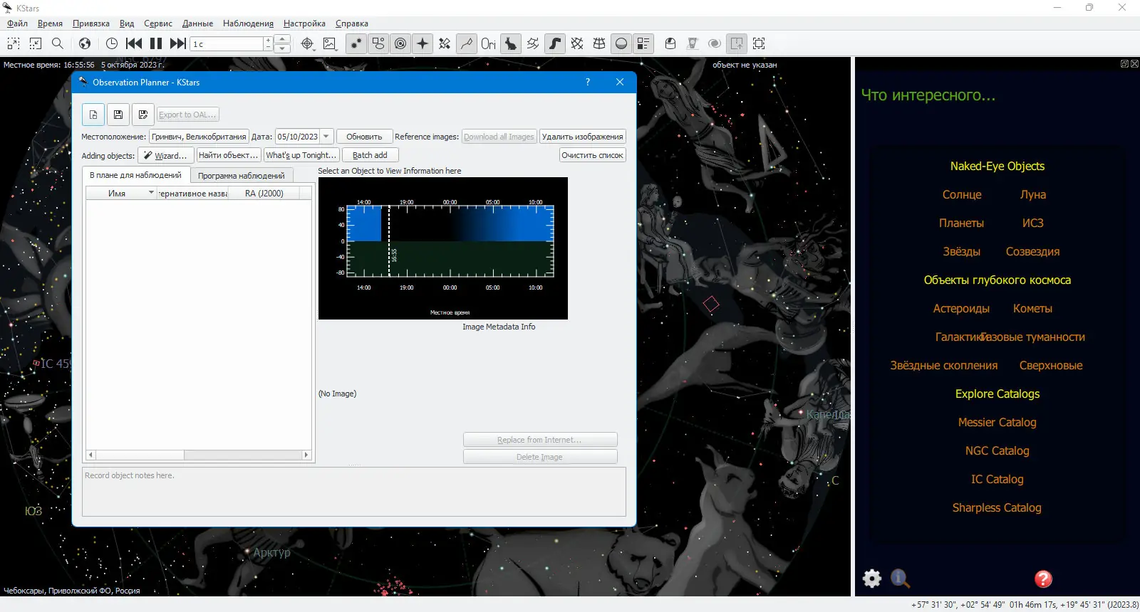 - Возможность работы с каталогами FITS и Digitized Sky Survey