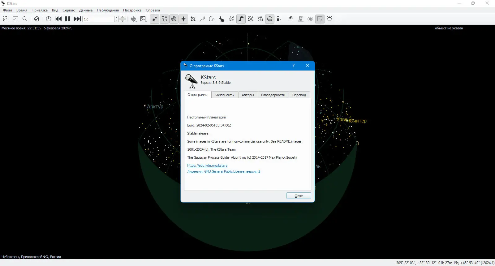 KStars — это бесплатное кроссплатформенное приложение с открытым исходным кодом, предназначенное для точной визуализации ночного неба в любое время и в любой точке планеты. Программа отображает до 100 миллионов звёзд, тысячи объектов глубокого космоса, планеты, спутники, кометы и астероиды, обеспечивая детализированную симуляцию астрономических явлений. В комплект входит Ekos — полноценный инструмент для астрофотографии, управляющий оборудованием через протокол INDI.