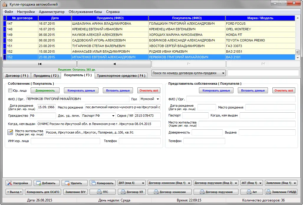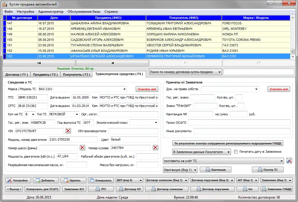 Программа «Купля-продажа автомобилей» разработана для упрощения и ускорения процесса оформления сделок с транспортными средствами. Она позволяет вести учёт всех договоров, автоматически заполнять документы, соответствующие действующему законодательству, и минимизировать риск ошибок при подготовке бумаг. Приложение поддерживает работу с физическими и юридическими лицами, а также интегрируется с базой КЛАДР для точного указания адресов. Все документы создаются в строгом соответствии с нормативными требованиями, что гарантирует их приём в регистрационных подразделениях ГИБДД.