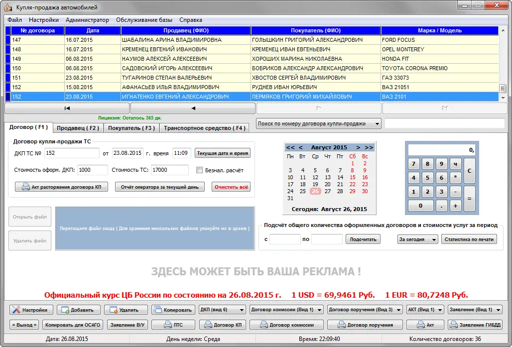 Главное преимущество программы — её ориентация на практическое применение в условиях реальной работы с документами. Пользователь получает не просто редактор, а готовое решение для оформления сделок, включающее все необходимые формы и соответствующее требованиям контролирующих органов. Удобная система поиска по номеру договора, ФИО участников или госномеру упрощает навигацию по архиву. Дополнительные инструменты, такие как встроенный калькулятор, календарь и поддержка паролей, повышают функциональность и безопасность.