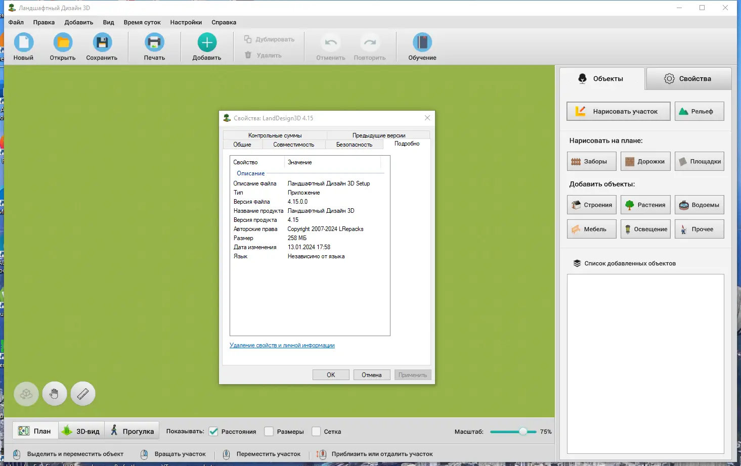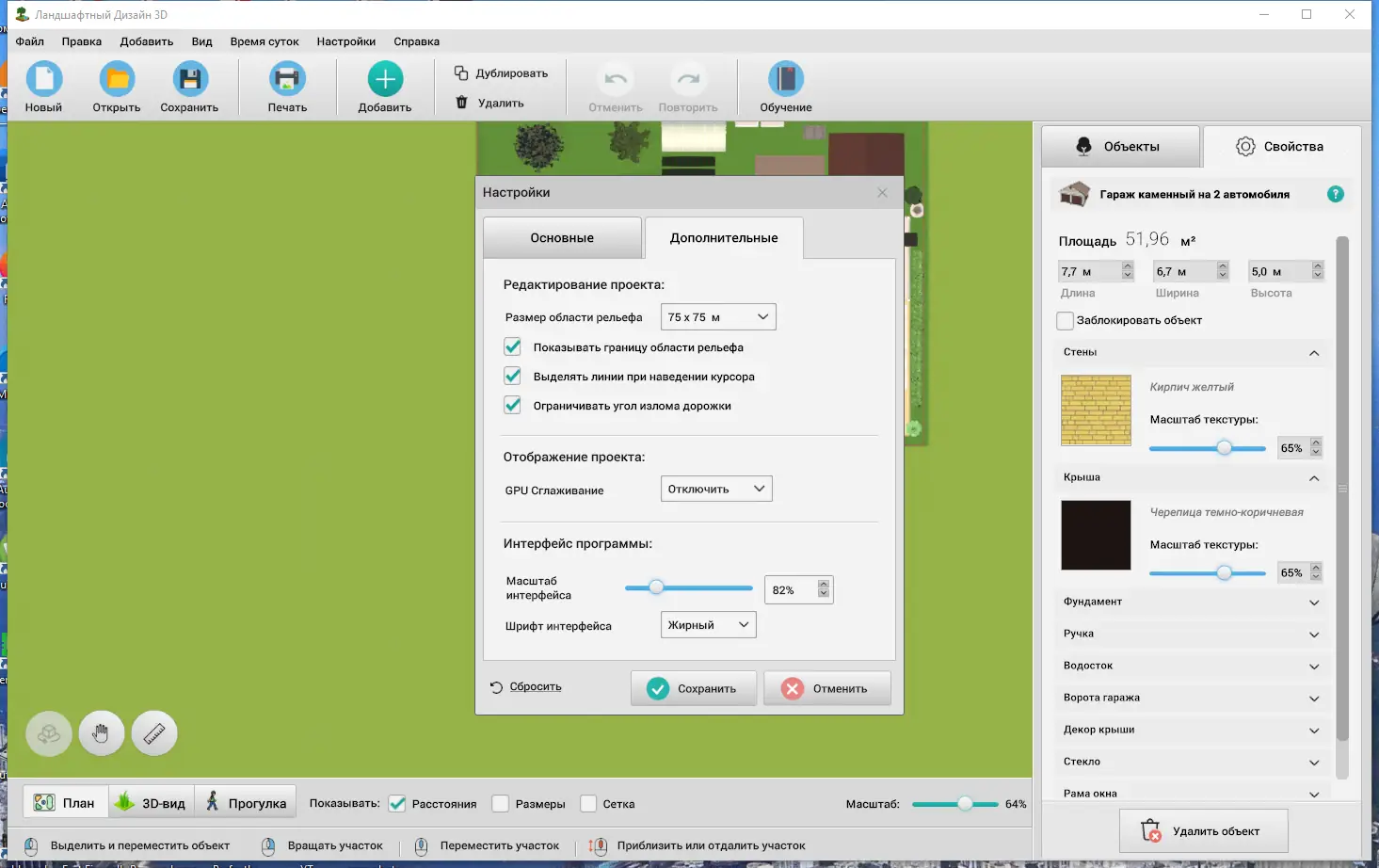 Программа предназначена для тех, кто хочет спланировать участок загородного дома или дачи без привлечения профессиональных дизайнеров. Она позволяет создать точный план территории с учётом всех пожеланий: от формы газона до расположения деревьев и построек. Все объекты добавляются из встроенного каталога, который включает более ста двадцати видов растений, садовую мебель, освещение, элементы ограждений и декоративные детали. Пользователь может в любой момент изменить текстуру покрытия, высоту забора или угол поворота строения, что делает процесс проектирования гибким и точным.