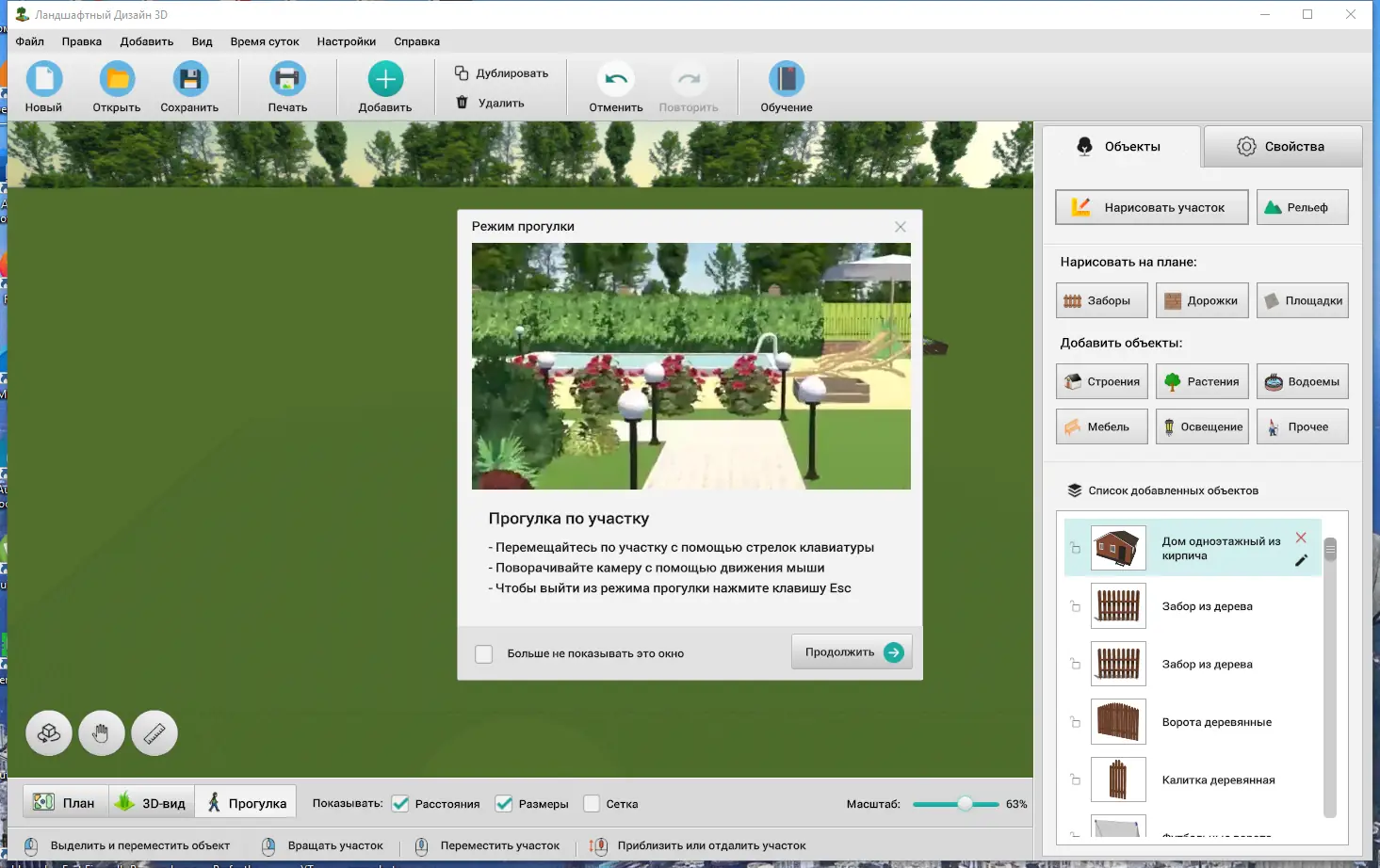 Работа с программой начинается с создания контура участка, который можно нарисовать вручную или задать параметры по размерам. Далее из каталога выбираются объекты: дом, беседка, мангал, качели, светильники и растения. Каждый элемент легко перетаскивается на сцену, поворачивается, масштабируется и настраивается по высоте или глубине. Можно выкладывать дорожки из разных материалов, строить заборы с калитками, изменяя расстояние между столбами и их высоту. После завершения компоновки проект просматривается в 3D-режиме, где доступна смена времени суток для оценки освещённости. Готовый план можно распечатать или сохранить в файл для будущих изменений.