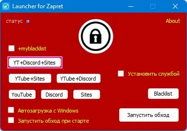 Для начала работы необходимо выбрать подходящий комплект файлов в зависимости от разрядности операционной системы — x86 или x64. После этого запускается основной файл Launcher for Zapret, который предоставляет доступ к основным функциям через графический интерфейс. Пользователь может переключать профили в зависимости от текущих задач: например, использовать режим YouTube+Sites для просмотра видео или YT+Dc для одновременной работы с YouTube и Discord. Обновление блэклистов осуществляется одной кнопкой, а настройки сохраняются между сеансами. Программа также поддерживает автозапуск при загрузке Windows, что делает использование максимально комфортным.